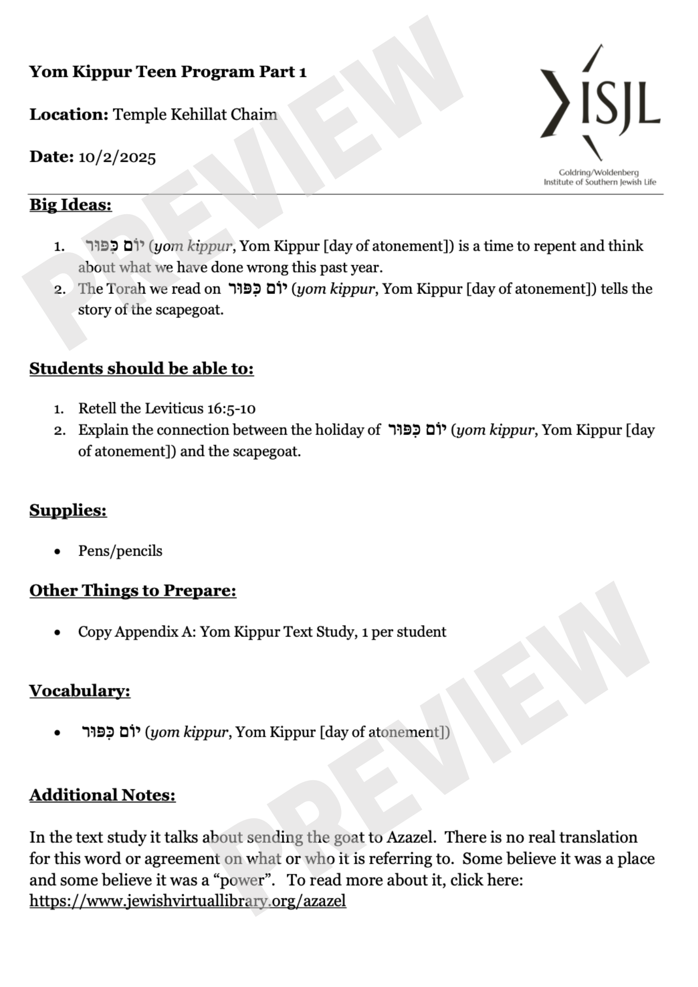 In this 30 minute program middle school and high school students will explore the origins of the expression "scapegoat". This text study gives students a look into the ancient practice of putting sins on the goat and allows them to explore how this relates to them today.