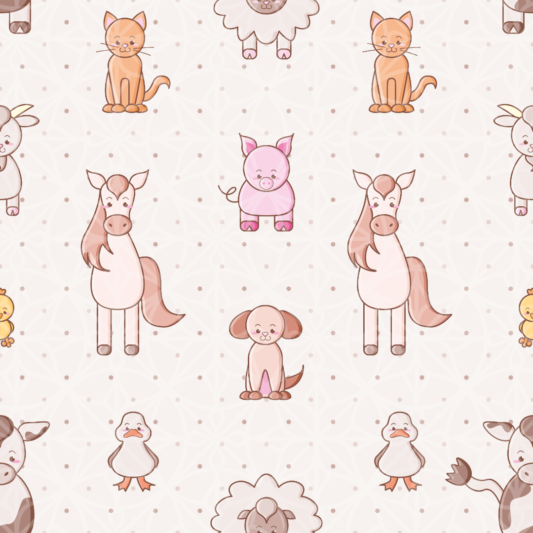 Kawaii farm animal seamless vector pattern with soft brown polka dot background.
