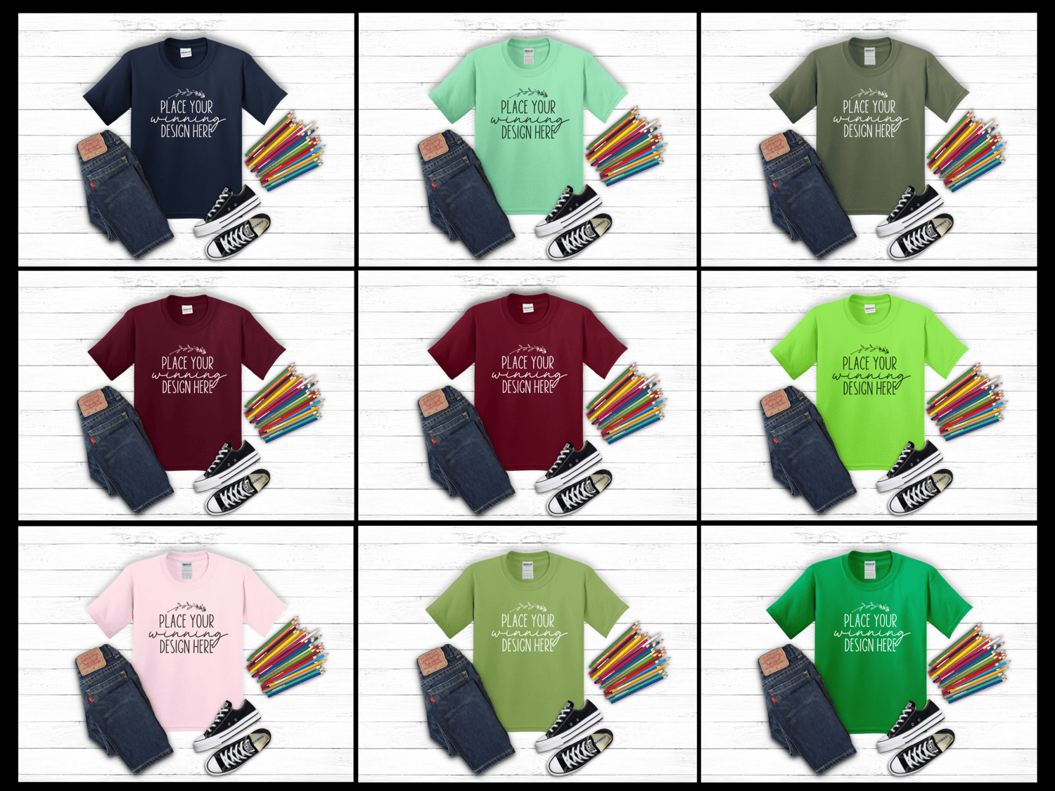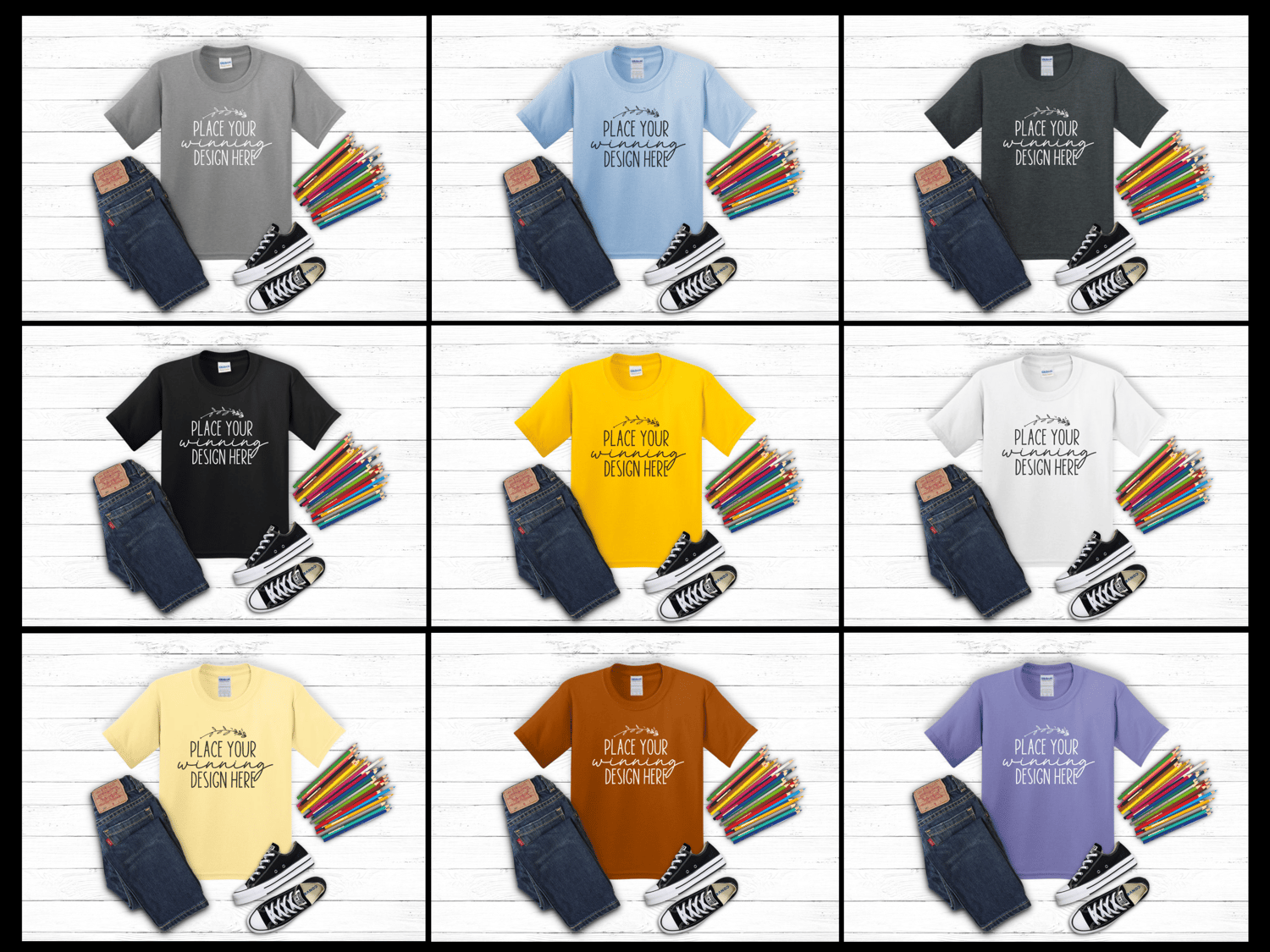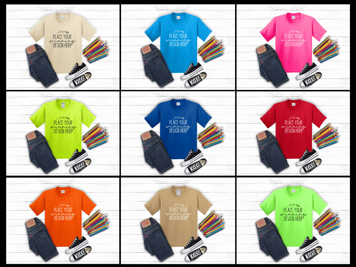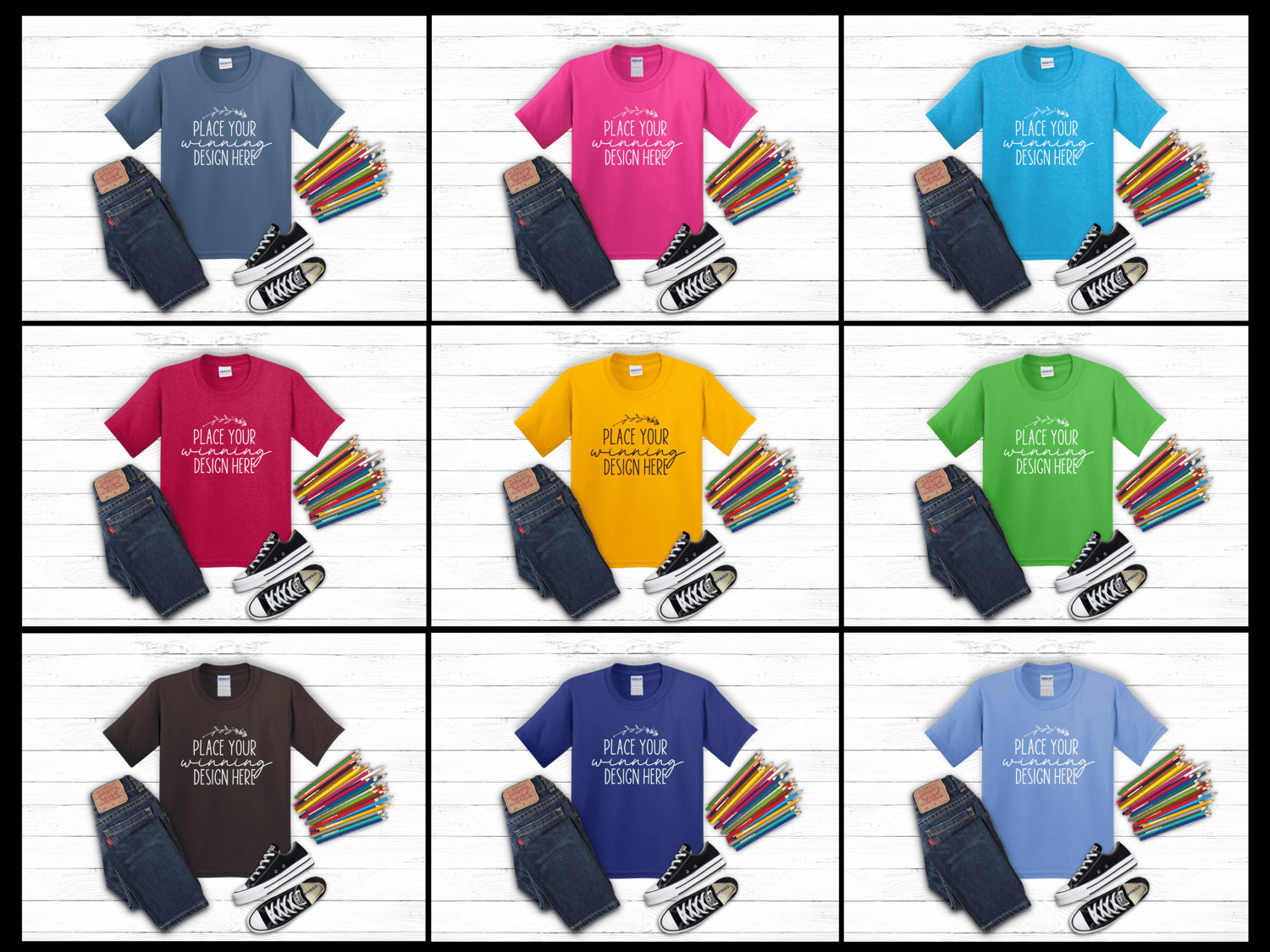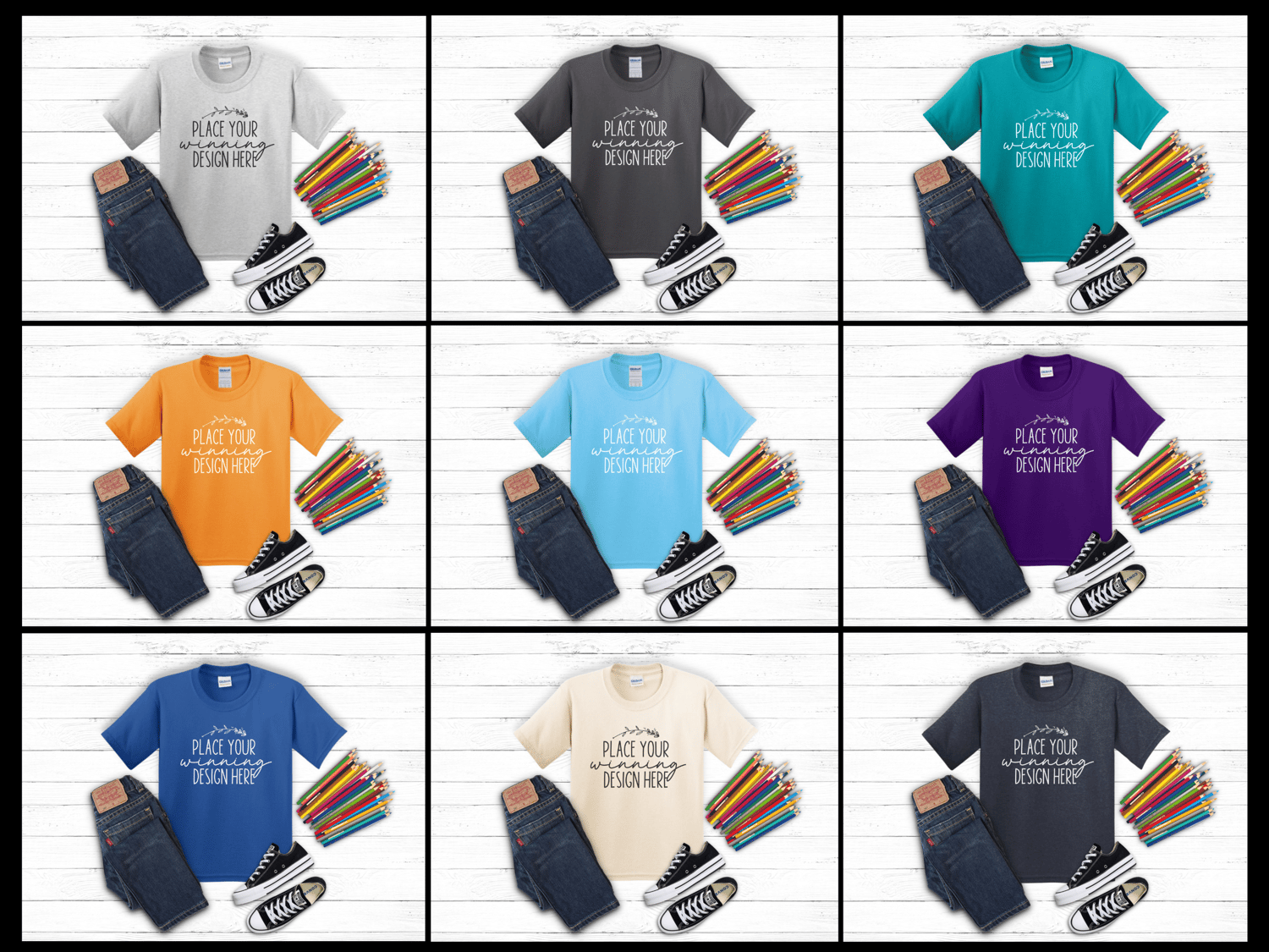 - This listing includes 48 x Gildan 5000b youth flat lay mockup lifestyle images to showcase your winning designs and help you appeal to even more potential customers. Colors included: Black, white, natural, coral silk, heather sapphire, heather navy, sky, graphite, tennessee orange, neon blue, tropical blue, garnet, purple, kiwi, yellow haze, cobalt, safety pink, mint green, electric green, heather red, indigo blue, charcoal, neon green, military green, sand, safety green, texas orange, violet, old gold, ash, lime, orange, yellow, dark heather, sport grey, light blue, irish green, red, charcoal, royal, navy, dark chocolate, sapphire, maroon, forest green, light pink, azalea, heliconia, daisy, carolina blue.