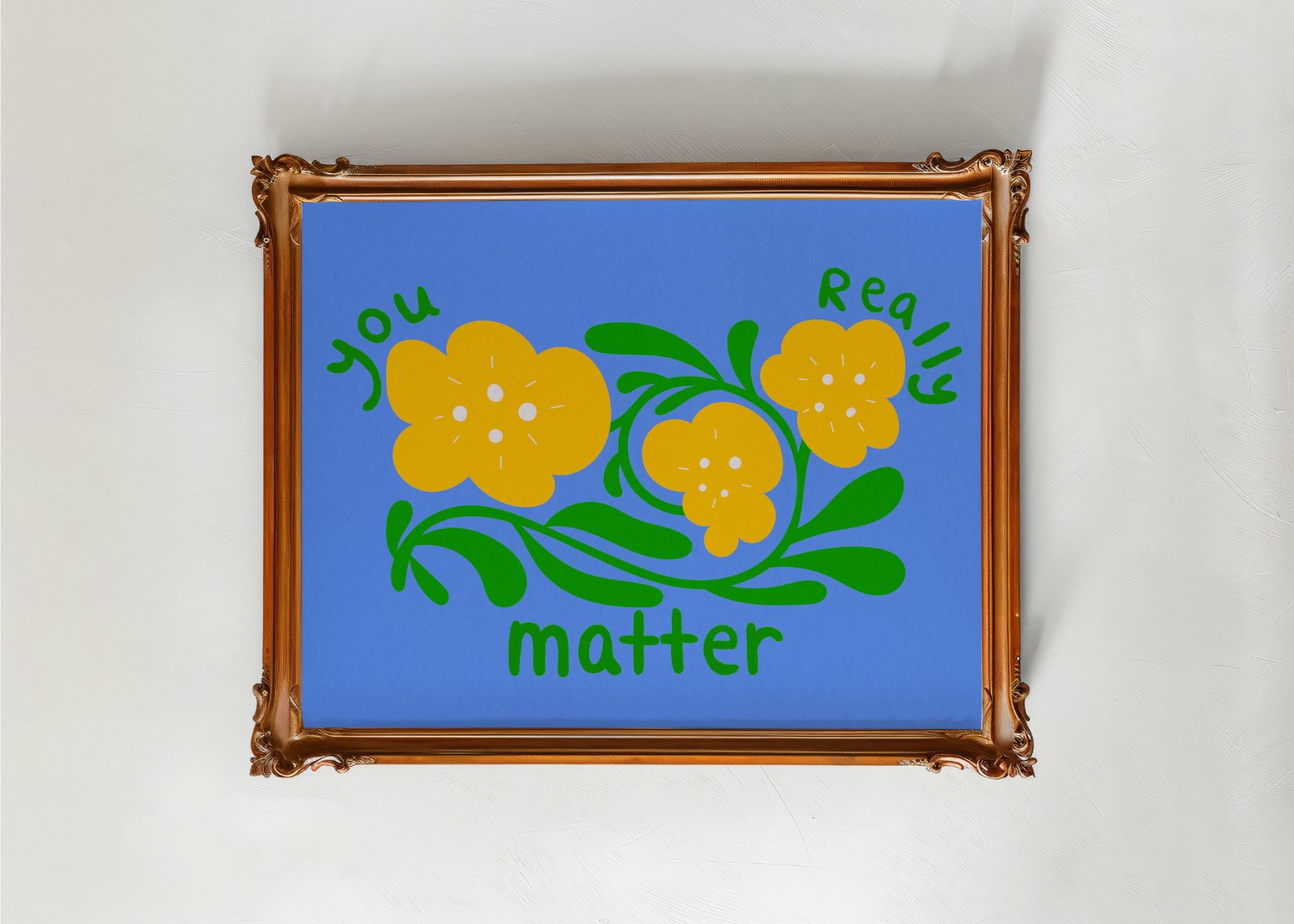 You Really Matter— Set against a vibrant blue background, bold yellow flowers bloom from delicate green stems. Floating above them, hand-drawn bubble letters whisper a quiet truth: you really matter. This piece radiates kindness with a gentle reminder that your presence is needed, your voice is heard, and your being is enough—just as you are.
