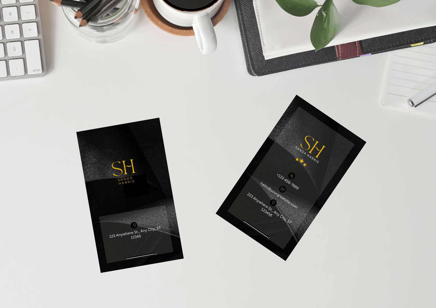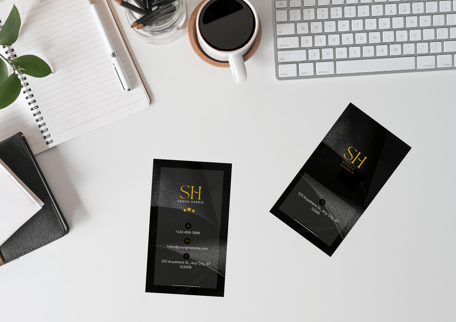 Hash tags> #BusinessCard #MinimalistDesign #GoldAndBlack #ProfessionalLook #Monogram #LuxuriousTexture #PersonalizedDesign #Moderndesign #SophisticatedStyle