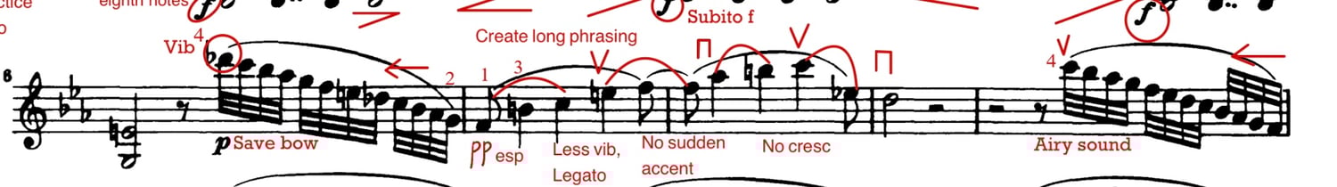 Each excerpt includes my personal bowings, fingerings, phrasing, musical ideas, audition tips, and practice strategies — refined through years of performing and auditioning with top orchestras.