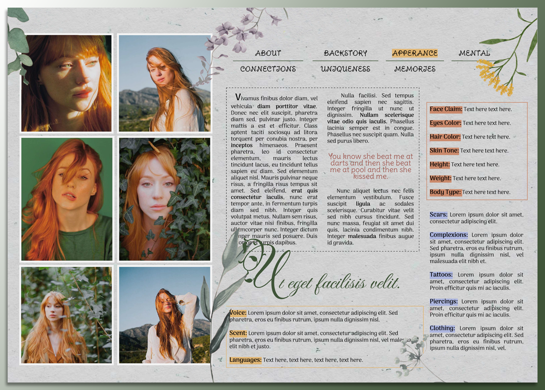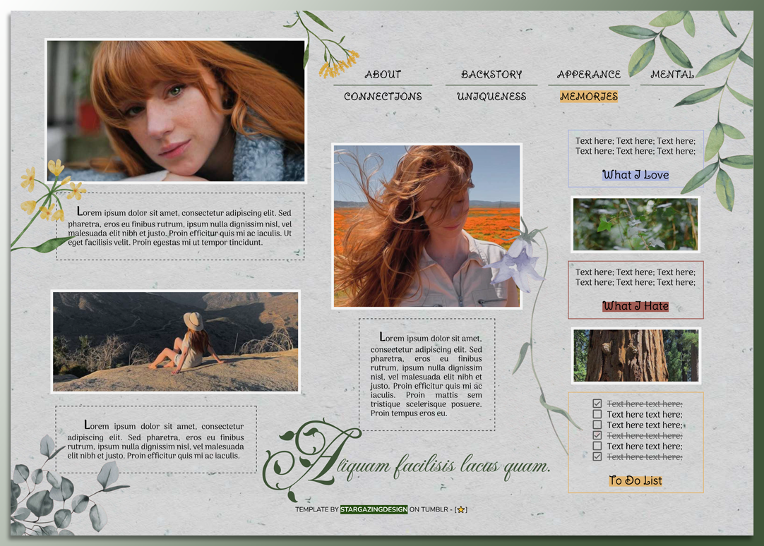 Placeholder pictures are of Alina Kovalenko, colorized in Photoshop with the psd Solstice from the amazing TigerEdits.