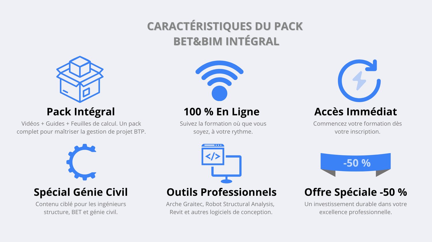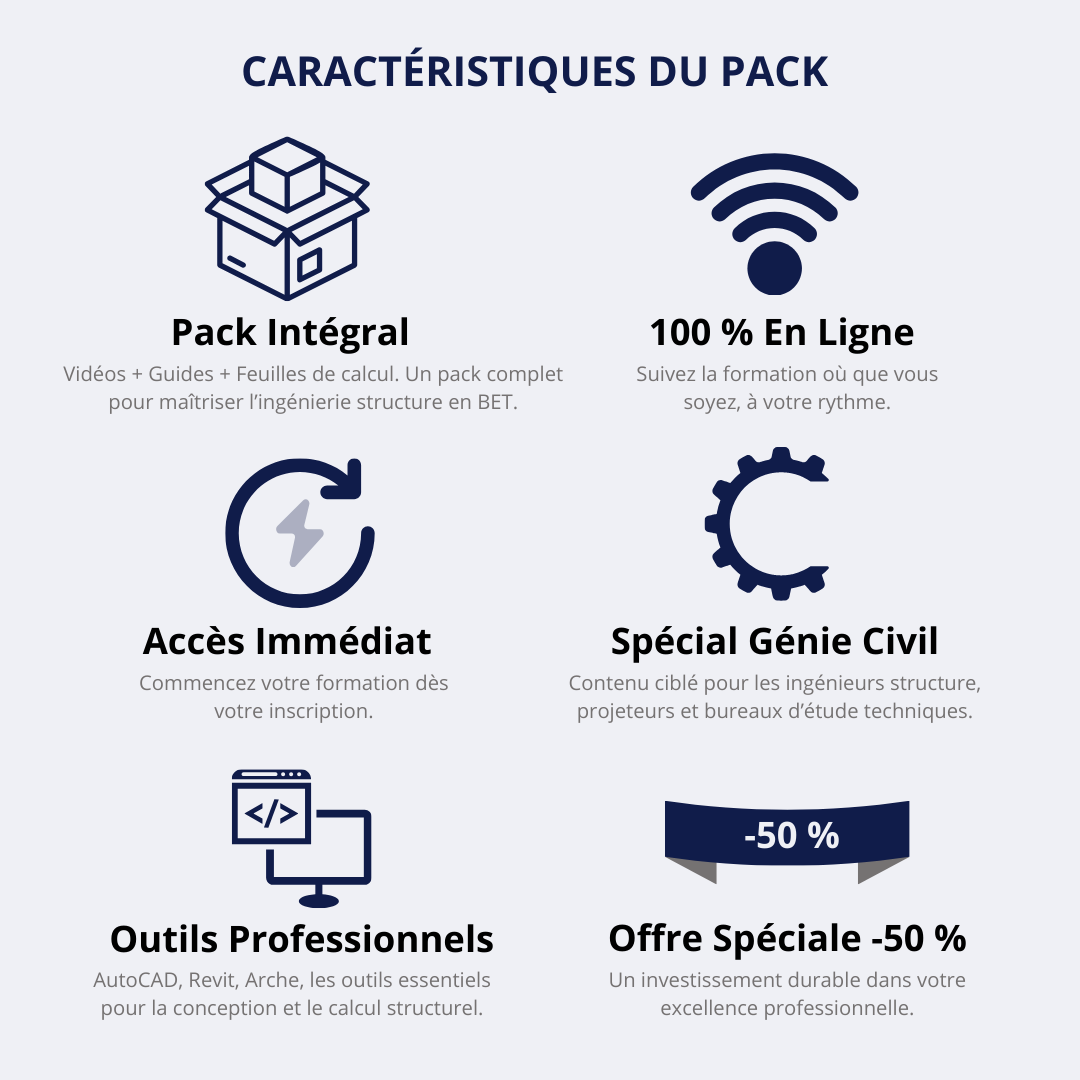 Le Pack BET&BIM® est une solution certifiée destinée aux ingénieurs bureaux d'études techniques souhaitant approfondir leurs compétences en conception, modélisation et dimensionnement des structures de bâtiment en béton armé.