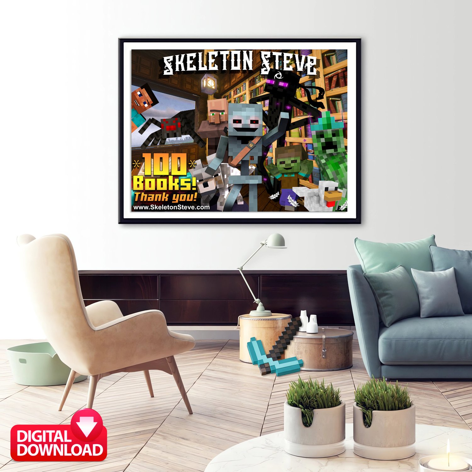 Skeleton Steve 100 Books Minecraft Poster Printable | Gaming Wall Art Digital Download | Kids Gamer Room Decor 24x18