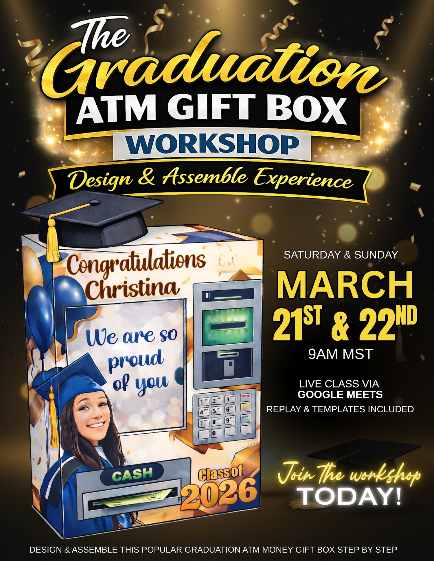 Join me for a 2 Day Live Workshop where we will design and assemble a custom Graduation ATM Gift Box from start to finish.
