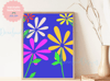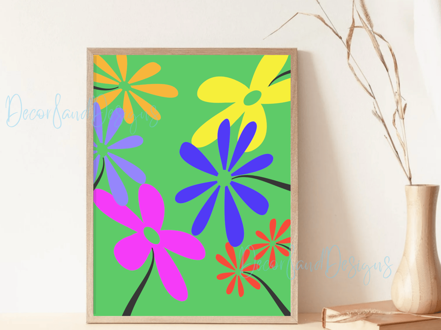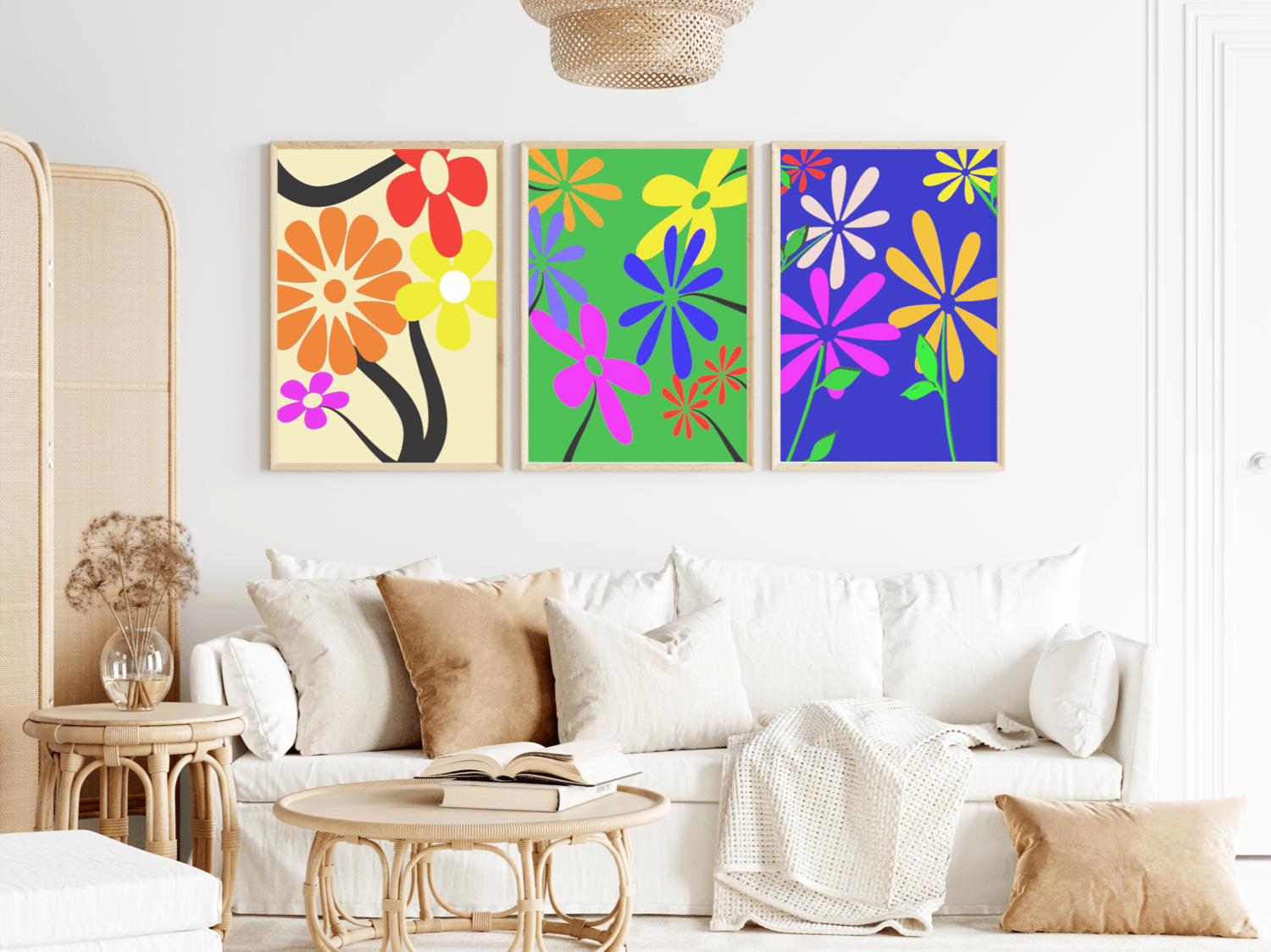 Flower Market style daisy abstract wildflower collection. A set of 3 uniquely styled floral prints to add a burst of color to any room: living room, dining room, bedroom, entrance , dorm or office space. With blue, green or cream backgrounds, lift a dull room with bright colors or use them individually in different rooms. Just like a bouquet of flowers but on your wall.