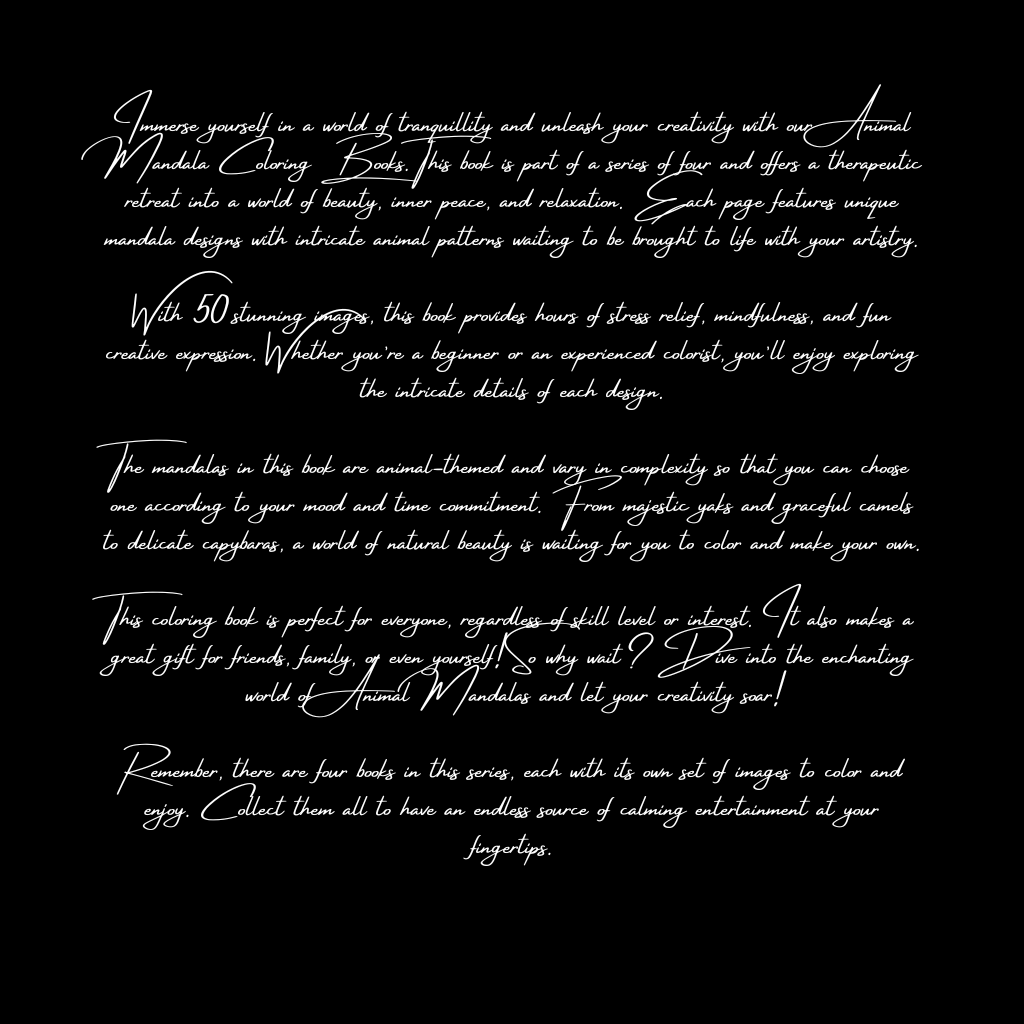 Immerse yourself in a world of tranquility and unleash your creativity with our Animal Mandala Coloring Books. This book is part of a series of four and offers a therapeutic retreat into a world of beauty, inner peace, and relaxation. Each page features unique mandala designs with intricate animal patterns waiting to be brought to life with your artistry.