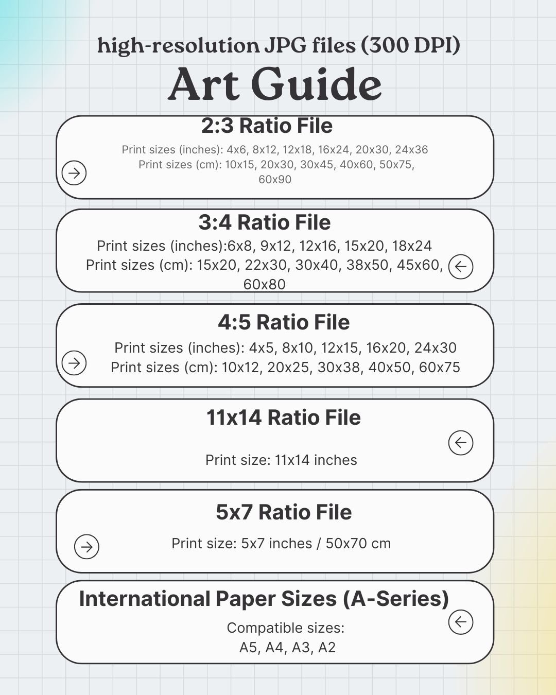 ► You will receive 5 high-resolution JPG files (300 DPI) that can be printed in the following sizes: