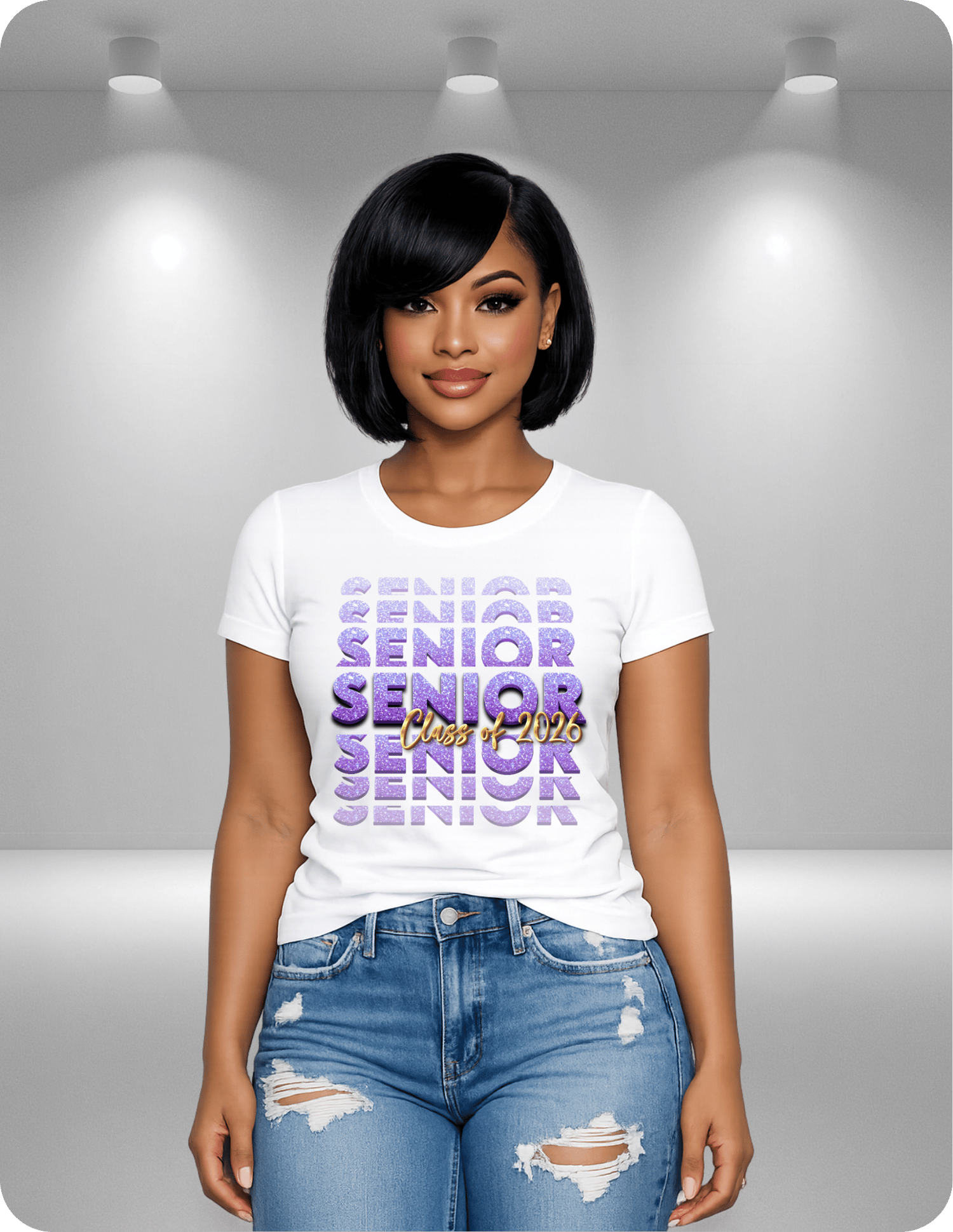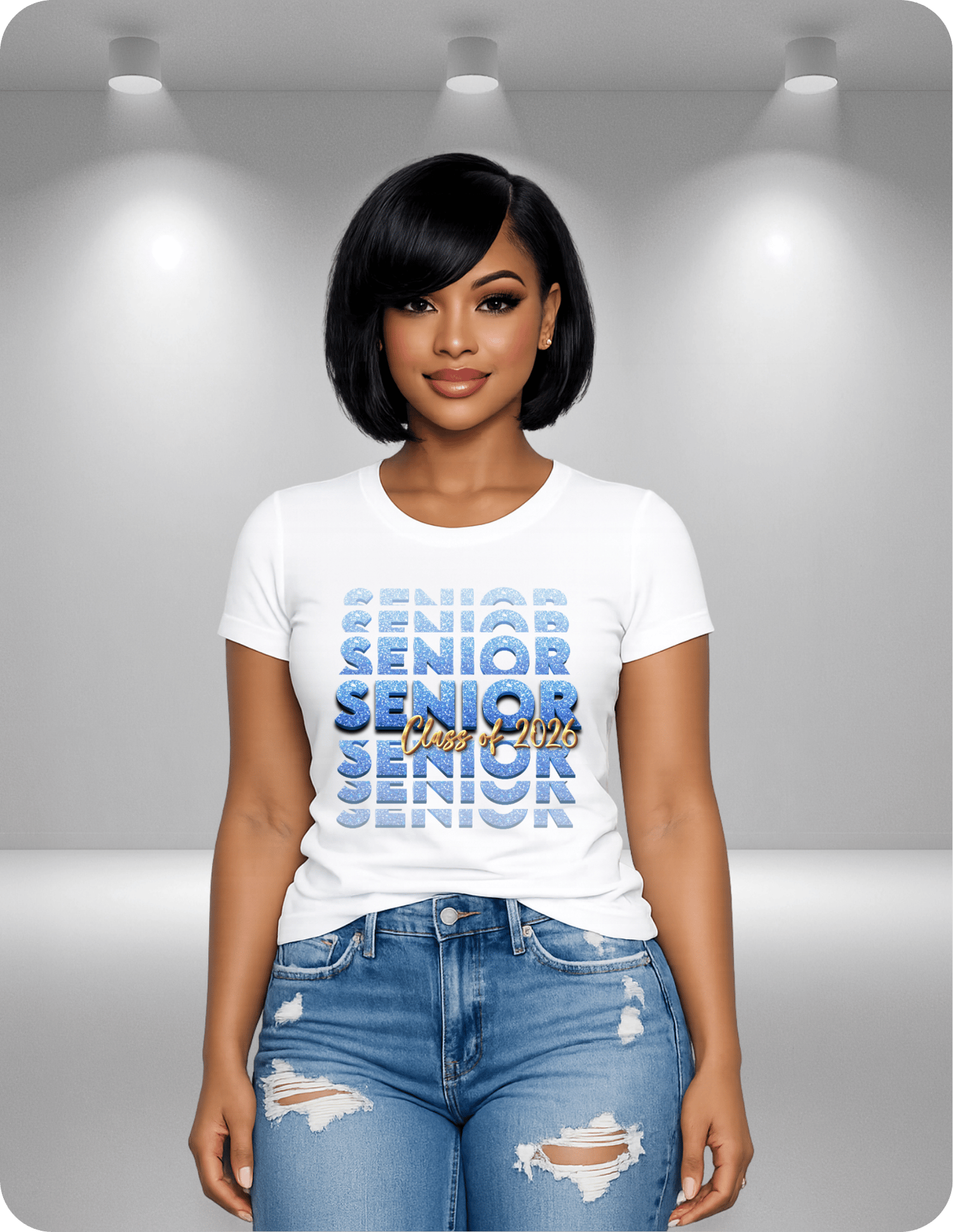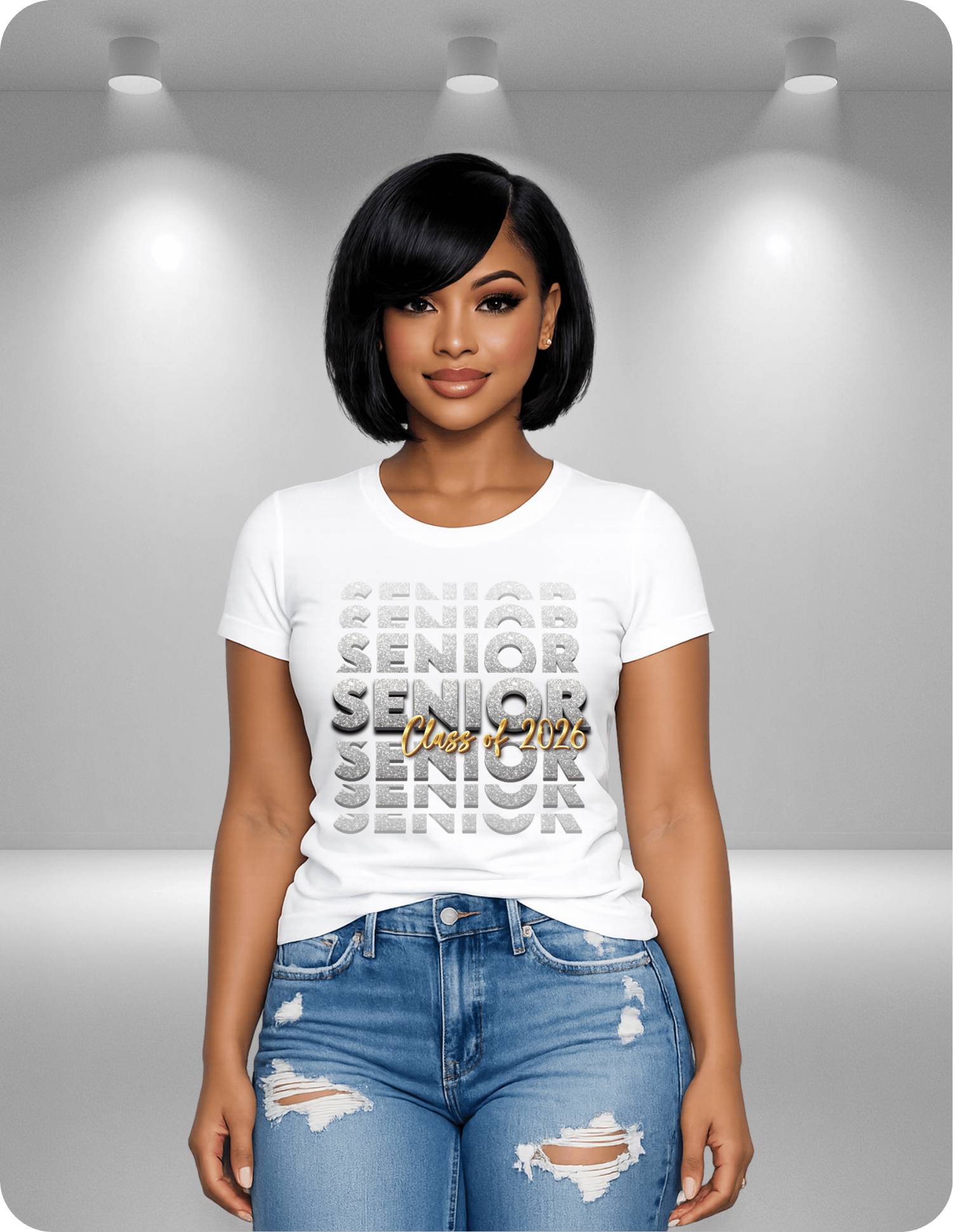 Celebrate your senior year in style with this eye-catching “Senior Class of 2026” design! Featuring a bold stacked layout with sparkling glitter-style lettering, this design makes a powerful statement that stands out from the crowd. Shirts do have a glitter finish. The gold “Class of 2026” script layered across the center gives it a luxe, celebratory finish.