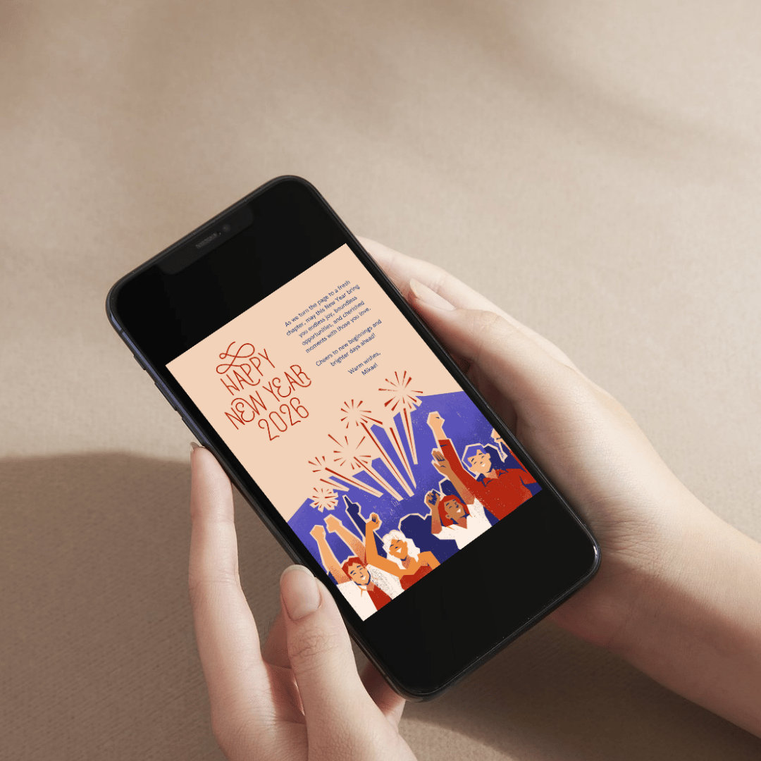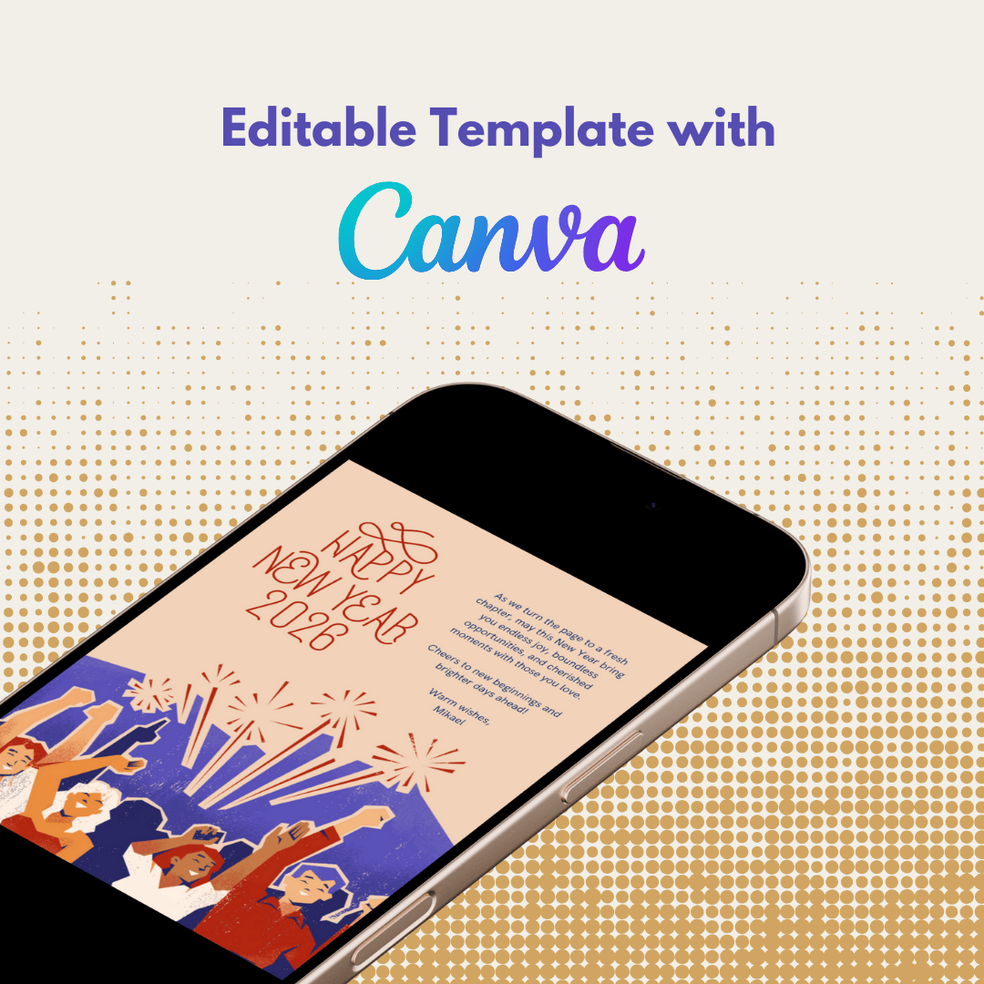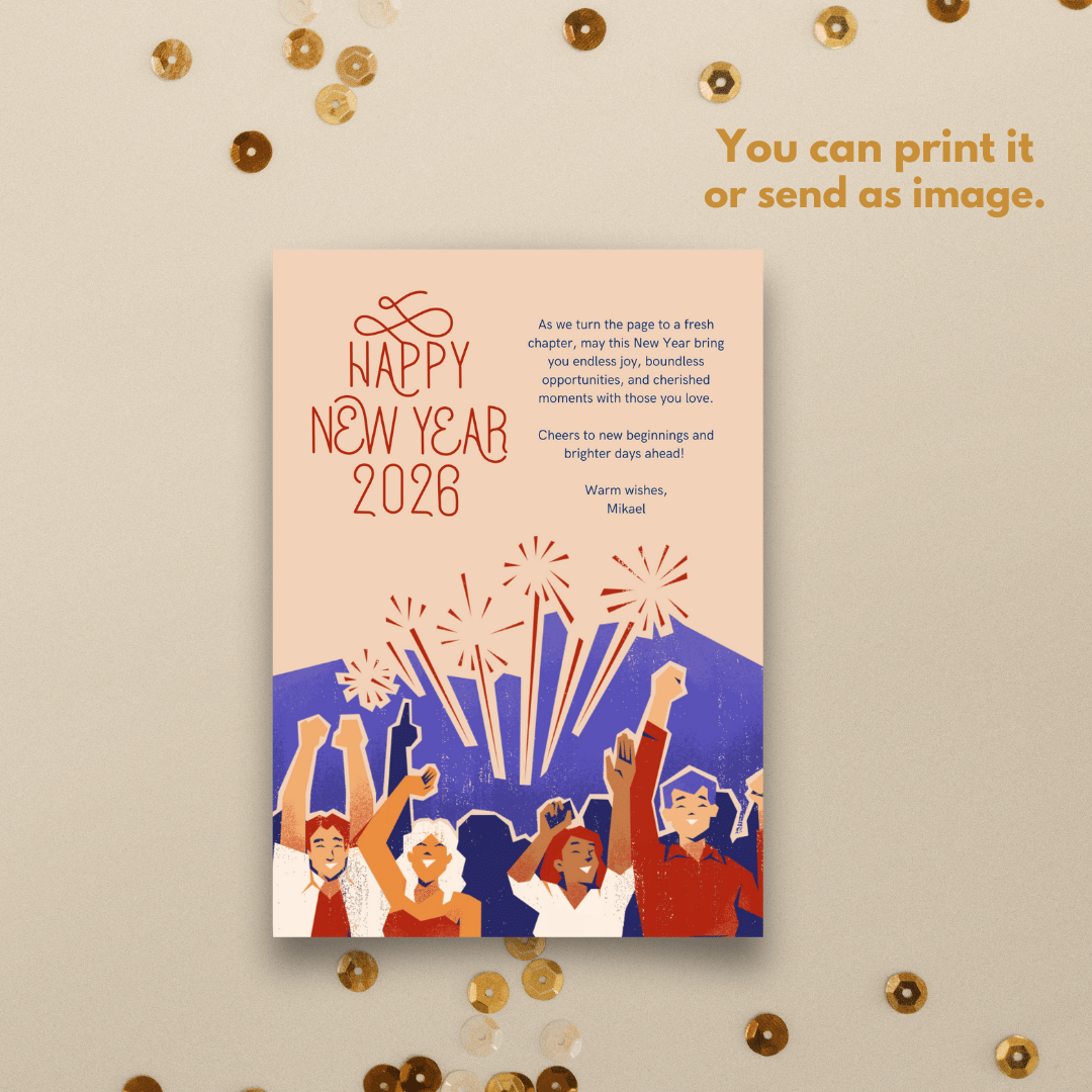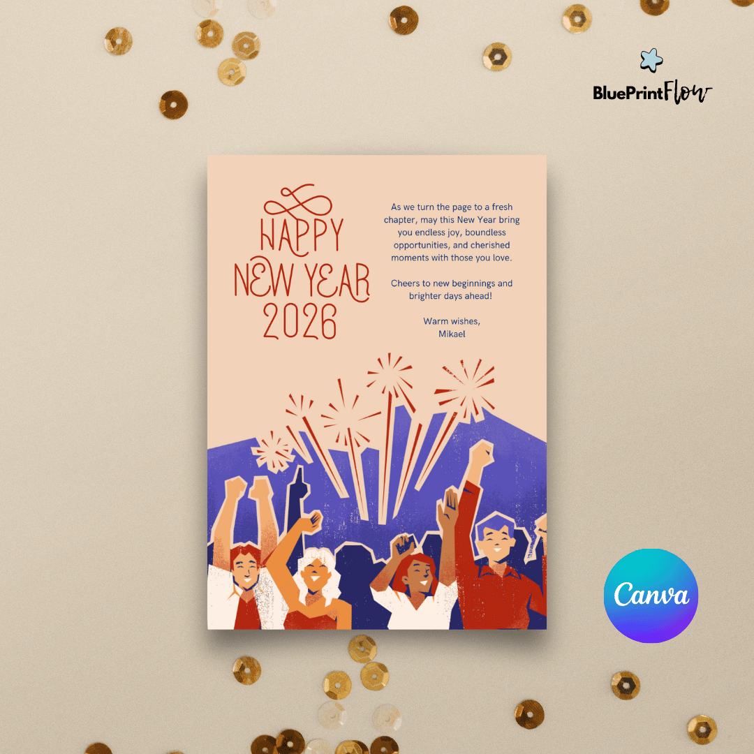 Welcome 2026 with style and joy! This New Year card features a modern and vibrant design with festive elements like fireworks and cheerful people, perfect for sharing your warm wishes for the upcoming year. Fully customizable on Canva, it’s ideal for friends, family, or coworkers.
