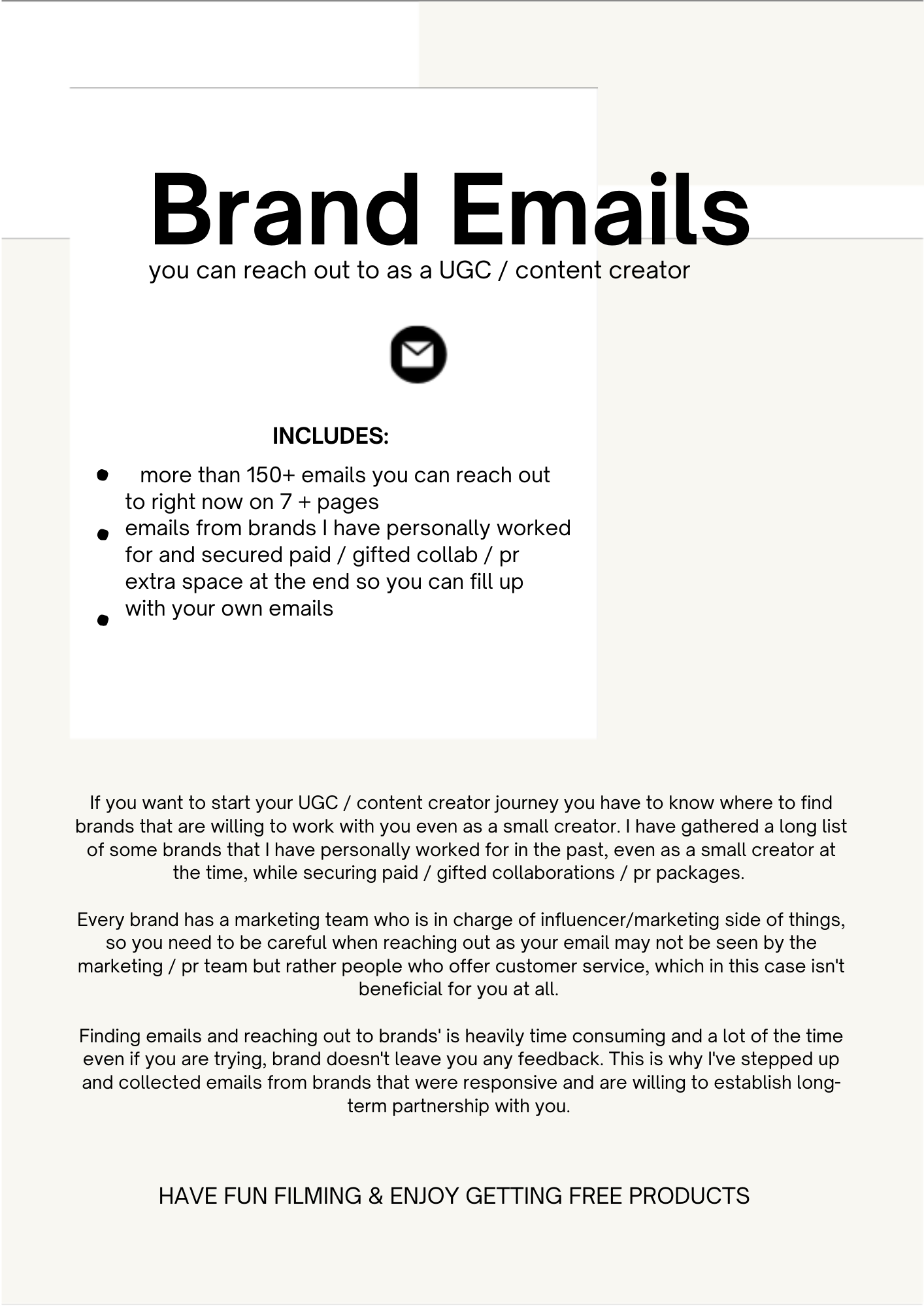 If you want to start your UGC / content creation journey you have to know where to find brands that are willing to work with you even as a small creator. I have gathered a 150+ email list of some brands that I have personally worked for in the past, even as a small creator at the time, while securing paid / gifted collaborations / pr packages.