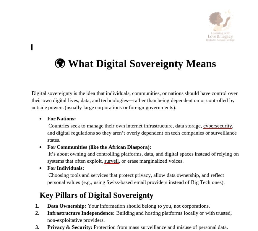 Digital sovereignty means having control over your own data, technology, and online choices without being subject to surveillance or foreign powers. In today’s world, your data is treated like currency — sold, tracked, and exploited. For the African community, protecting digital sovereignty is more than privacy — it’s about freedom, independence, and building legacy in a digital age.