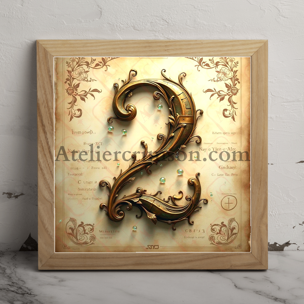 Number 2 Art Nouveau alchemical Each character crafted as a stunning 3D brass sculpture with weathered patina, set against a mystical alchemical parchment. Ornate vines, floating bubbles, and antique gears create a magical shabby chic atmosphere. Perfect for vintage-inspired designs, book covers, or unique wall art."