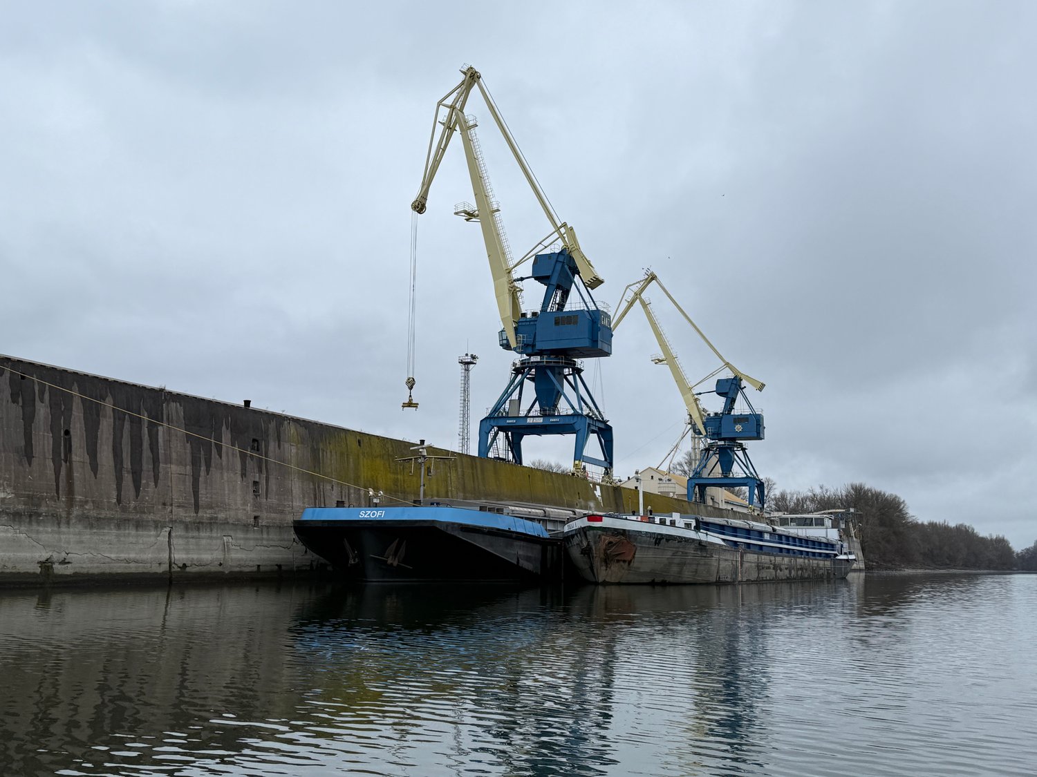 Large industrial harbor cranes tower above a cargo ship moored along a concrete quay on a calm river. The overcast sky and muted colors emphasize the utilitarian atmosphere of inland shipping, logistics, and heavy industry.