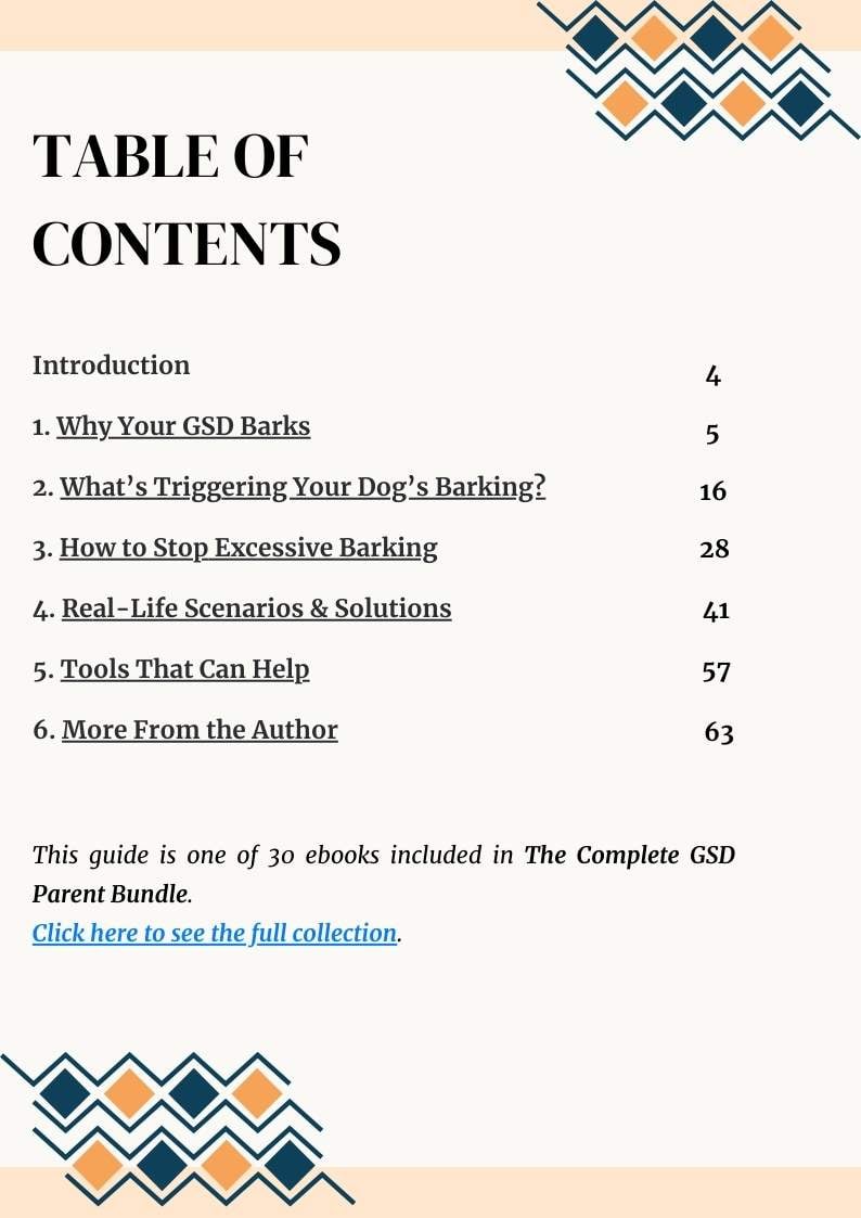 “How to Stop Your German Shepherd’s Excessive Barking” is a practical, easy-to-follow ebook written specifically for German Shepherd owners who want real solutions that actually work.
