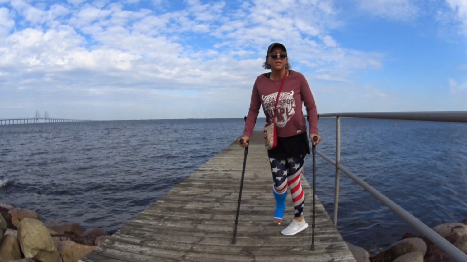 Bella is crutching out onto a pier with her blue short leg cast.Perhaps it's a bit slippery on the pier to use the crutches so she decides to put them aside and jump out on one leg with only the handrail as aid.