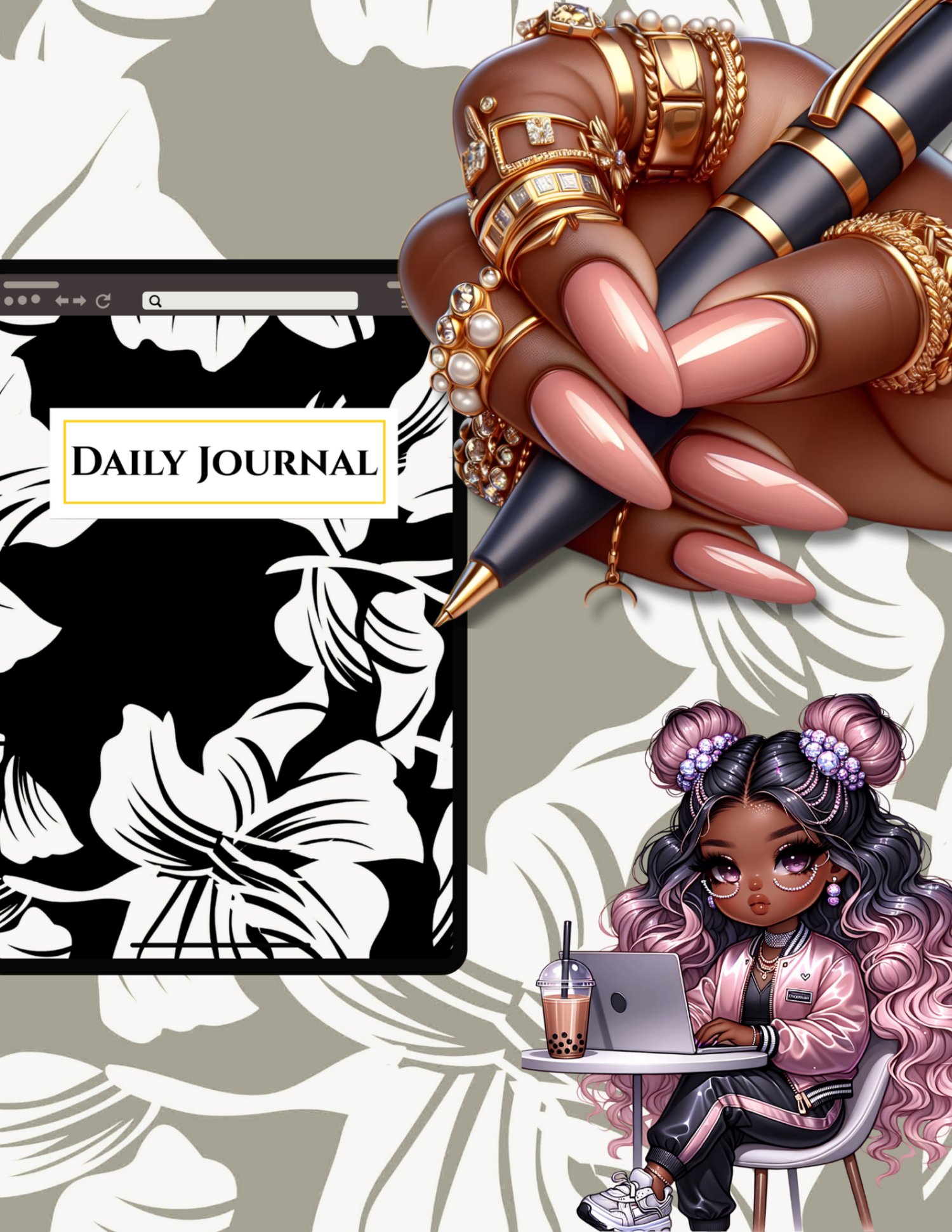 This Daily Journal digital cover blends elegance, creativity, and modern Black-girl luxury. Featuring a richly detailed hand adorned with gold jewelry and glossy nails holding a pen, paired with a stylish chibi creator working on her laptop, this design celebrates journaling as a power move, not a chore.