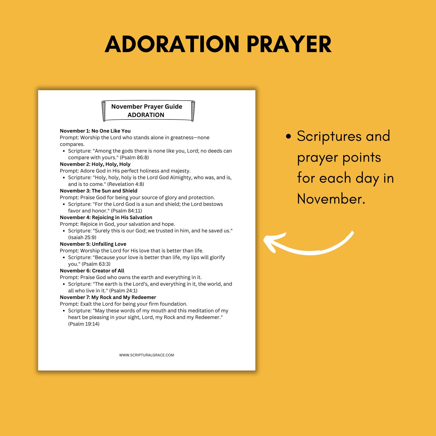 🙏 Each day in the November Prayer Journal begins with scripture-based prompts for adoration, confession, and thanksgiving. These carefully chosen verses and prayers will guide your heart into worship, help you surrender burdens, and remind you to give thanks for God’s daily goodness.
