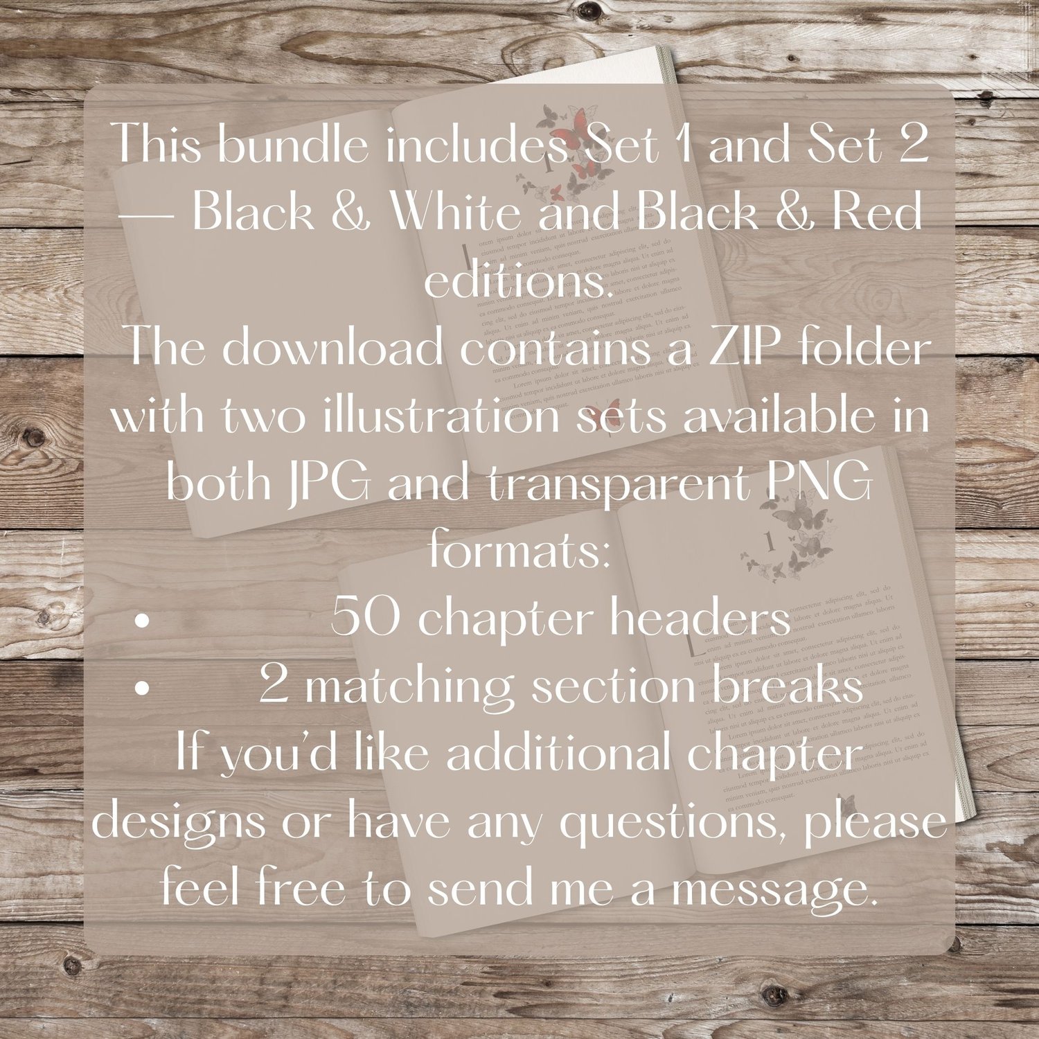 Whether you prefer the timeless simplicity of black and white or the bold sophistication of black and red, this Butterfly Chapter Header Bundle gives you both — beautifully designed, easy to use, and ready to elevate your next book project.