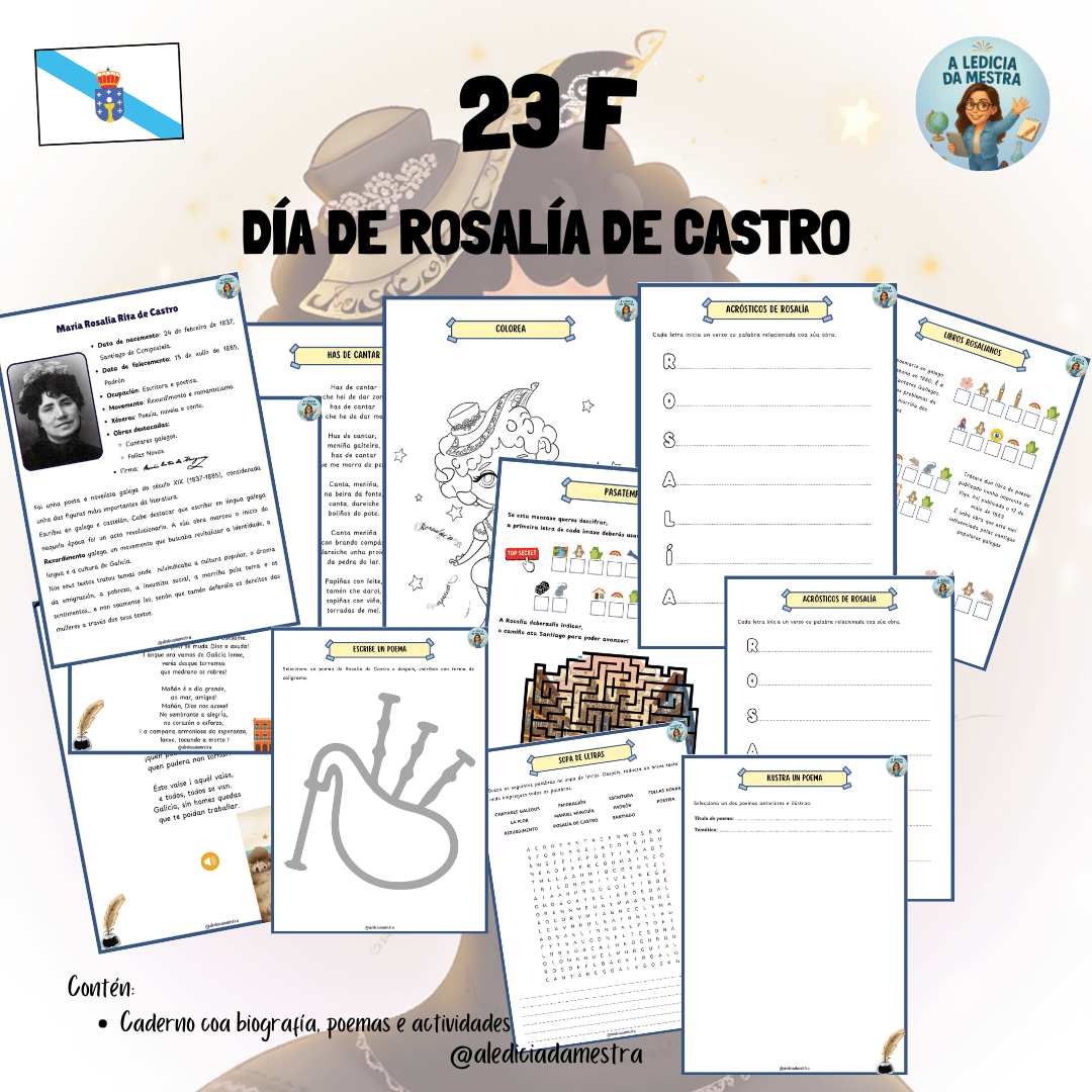 Con este cuadernillo poderás traballar o Día de Rosalía a través de:
