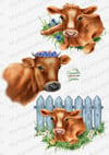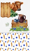Milk farm compositions: cow, cute baby calf, clay pitcher, clay mug, cornflowers, wooden fence, grass, pasture.