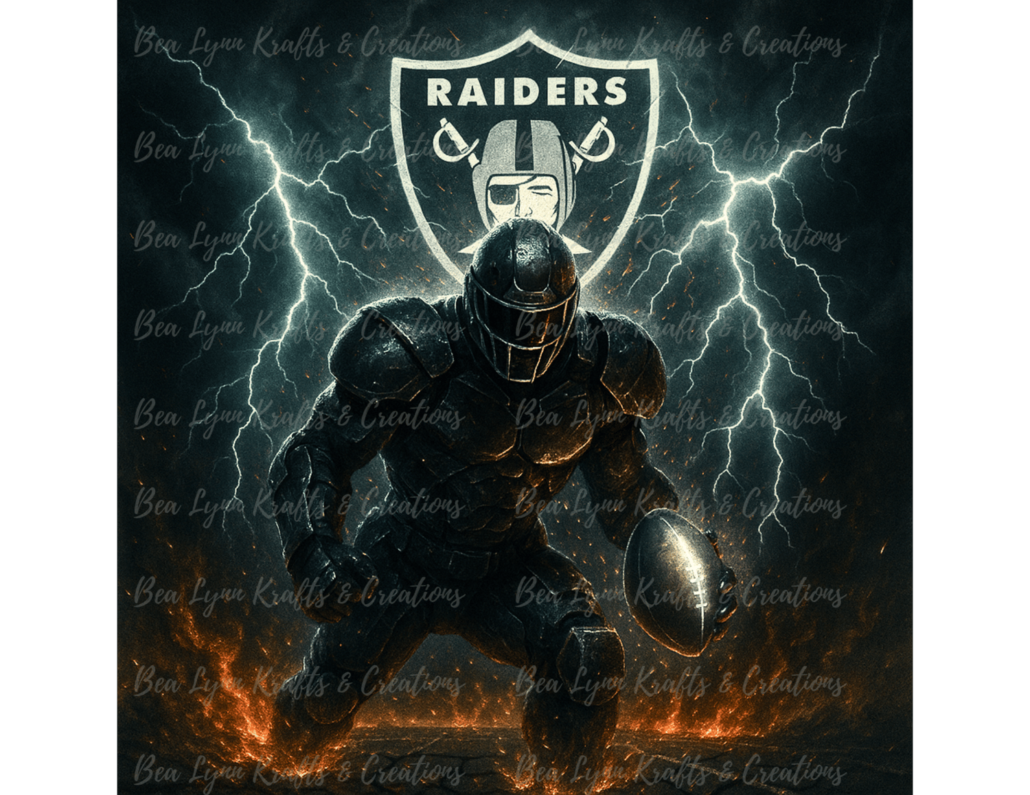 Prepare to pillage the merch game with this Las Vegas Raiders Warrior PNG! This unstoppable gridiron gladiator is fully armored in sleek black, holding a glowing silver football as he charges through fire and lightning beneath the legendary Raiders shield logo. It’s dark. It’s dangerous. It’s 100% Raider Nation energy.