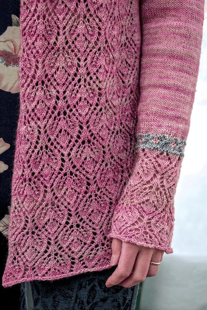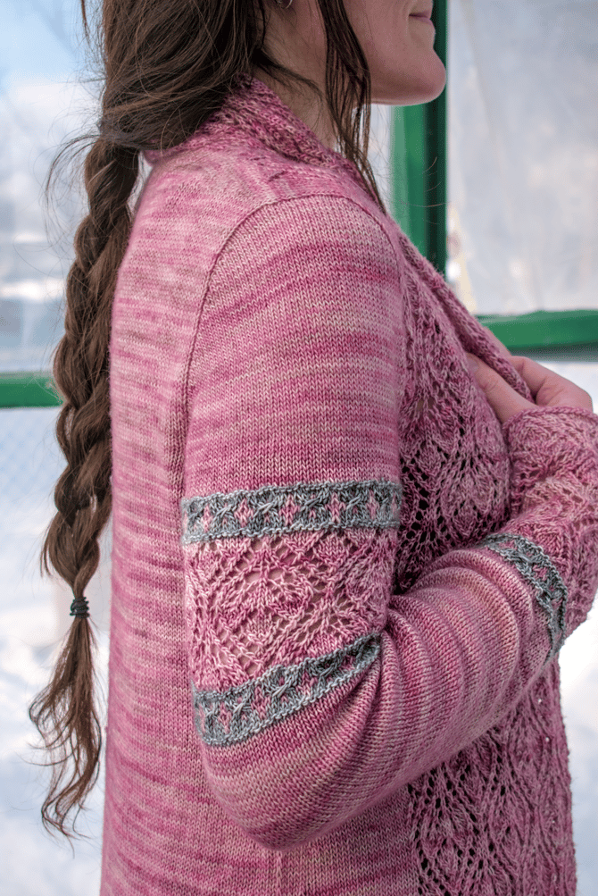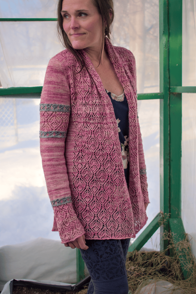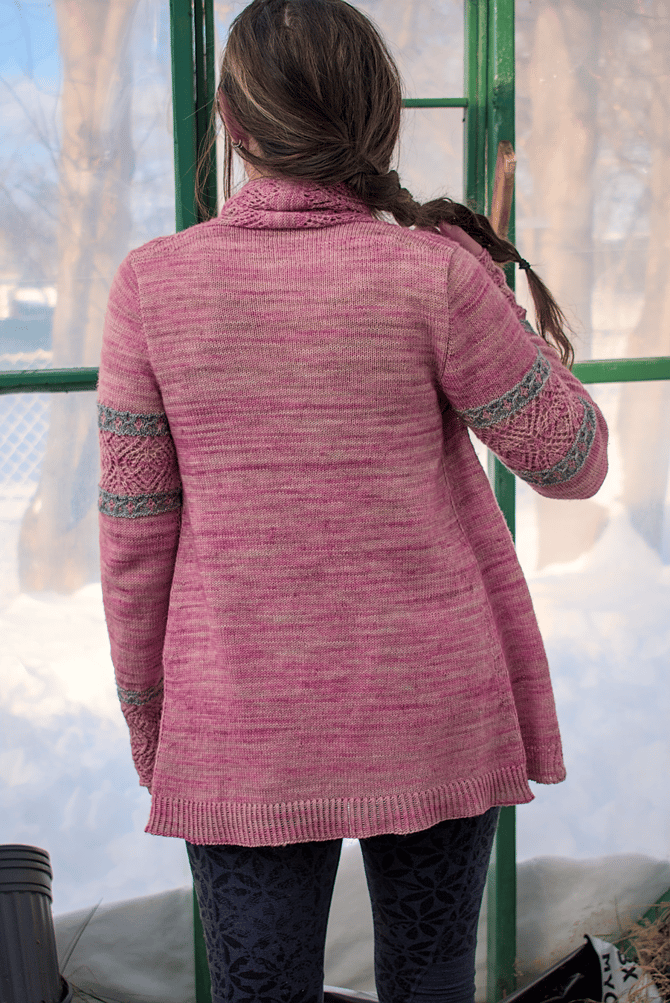 It’s a top-down, open front cardigan with a drapey shawl collar hugging your neck and seamless set-in sleeves giving you a beautiful and classic fit. Little bands of stranded colourwork and cables on the sleeves give the cardigan a rugged bohemian feel and looks great whether you choose a low or high contrast colourwork combo, or even if you use only a single colour throughout.