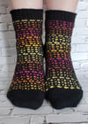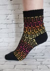 I love using slip stitch patterns with stripes and gradients, since you can get some really colorful results. I began this design with the cuff-down version, and then quickly realized that a toe-up version would work just as well—so the pattern has directions for both! If you work one of each, you can get a matching but subtly different pair of socks, one with the arrows pointing up and one with the arrows pointing down.