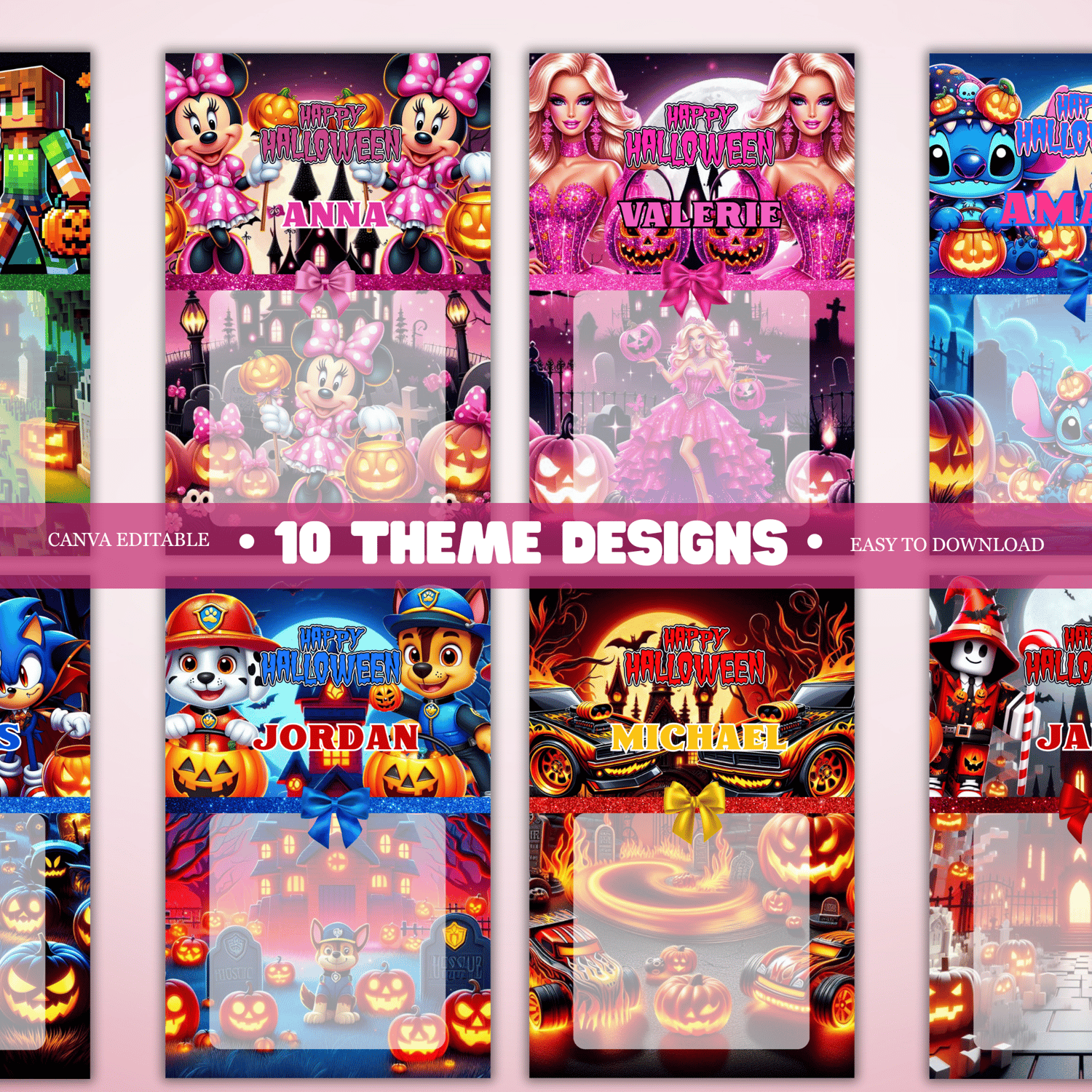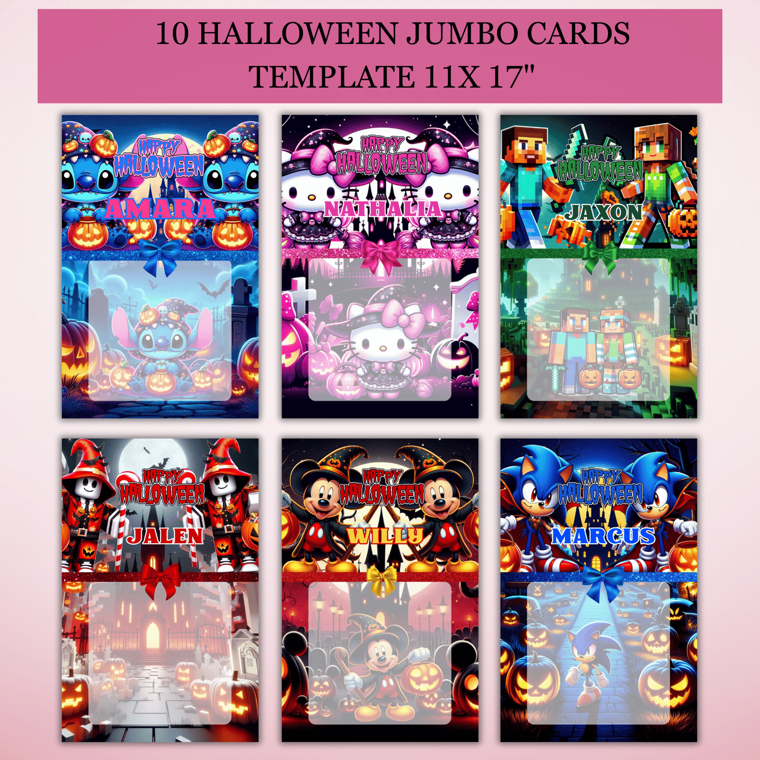 "Bring the magic of Halloween to life with this 10-pack Halloween Jumbo Cards Template featuring fan-favorite characters like Stitch, Hello Kitty, Minecraft, Roblox, and more! Perfect for party décor, kids’ activities, trick-or-treat fun, or creative DIY crafts spooky, cute, and ready to print!"