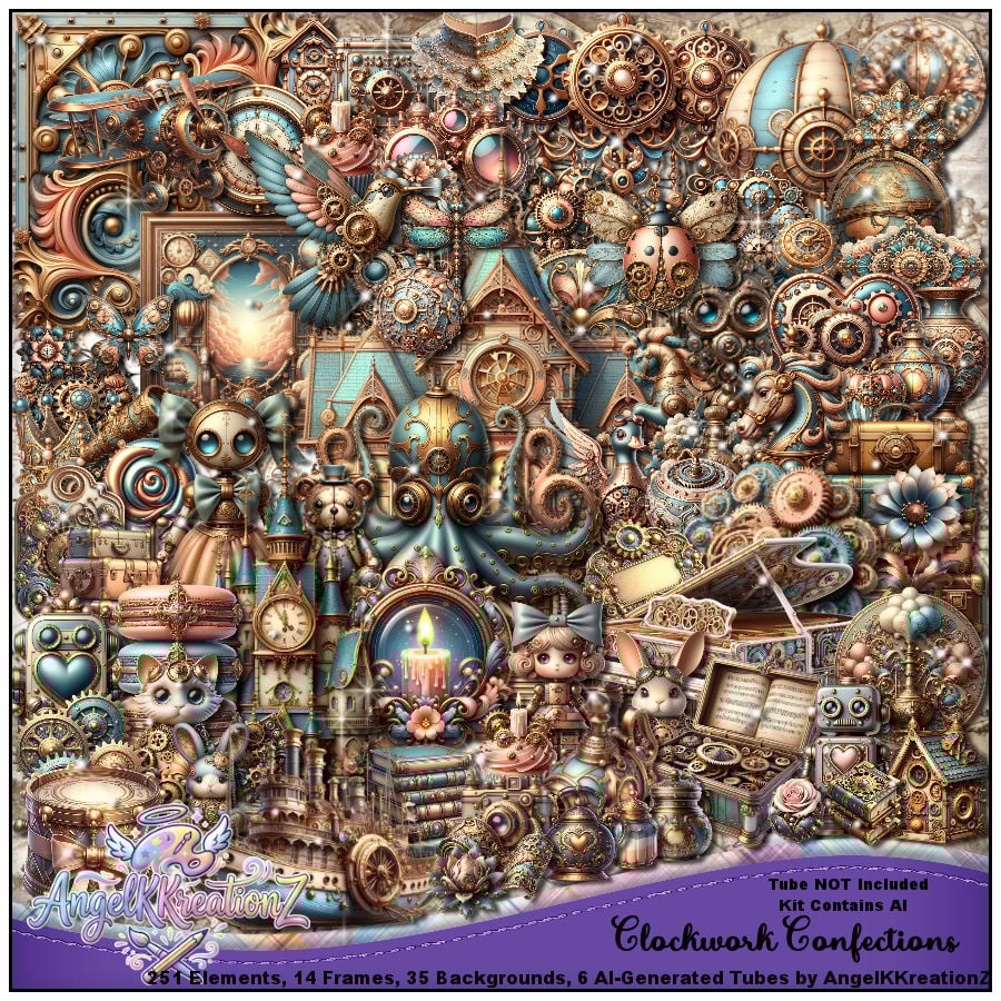🧁Step into a whimsical world where sugar, steam, and imagination collide. Clockwork Confections blends Victorian charm with playful steampunk fantasy, featuring delicate gears, puffed dresses, glowing candles, and confection-inspired details. Inspired by vintage doll aesthetics and soft mechanical elegance, this kit is perfect for fairytale layouts, magical birthdays, fantasy journaling, and whimsical steampunk designs.🧁