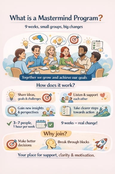 A mastermind is not a traditional class or therapy. It is a structured space for growth, commitment, and mutual support.