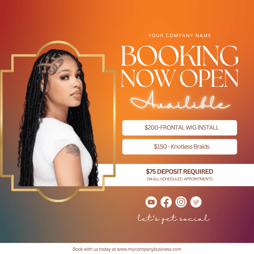 5 booking flyers—perfect for hairstylists, lash techs, nail artists, and beauty creatives! Each flyer features warm autumn tones and editable elements that allow you to easily add your own images, logos, and custom wording.