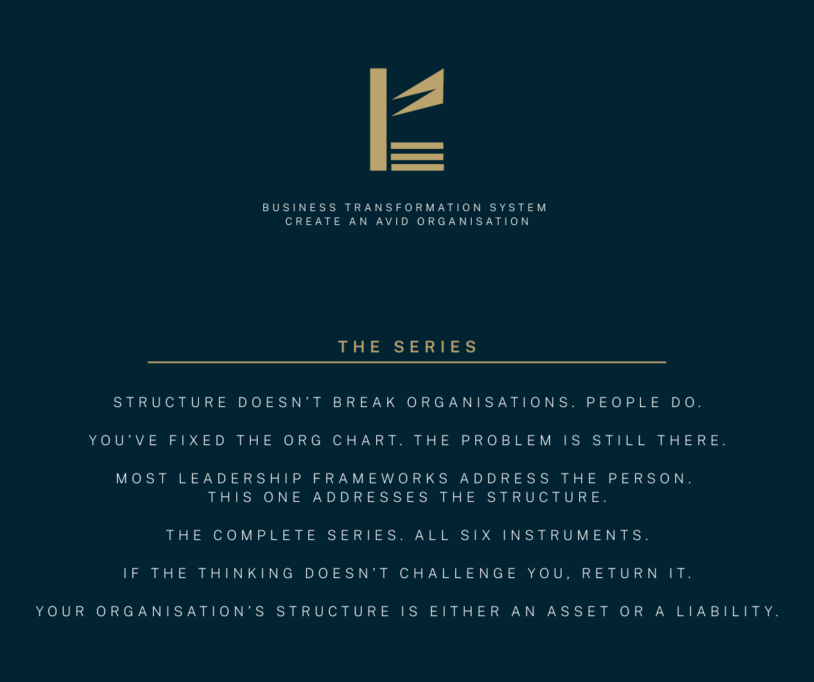 Six complete frameworks. Six sets of diagnostic tools. Six implementation guides. One coherent system for building an organisation that is structurally intelligent — not just strategically ambitious.