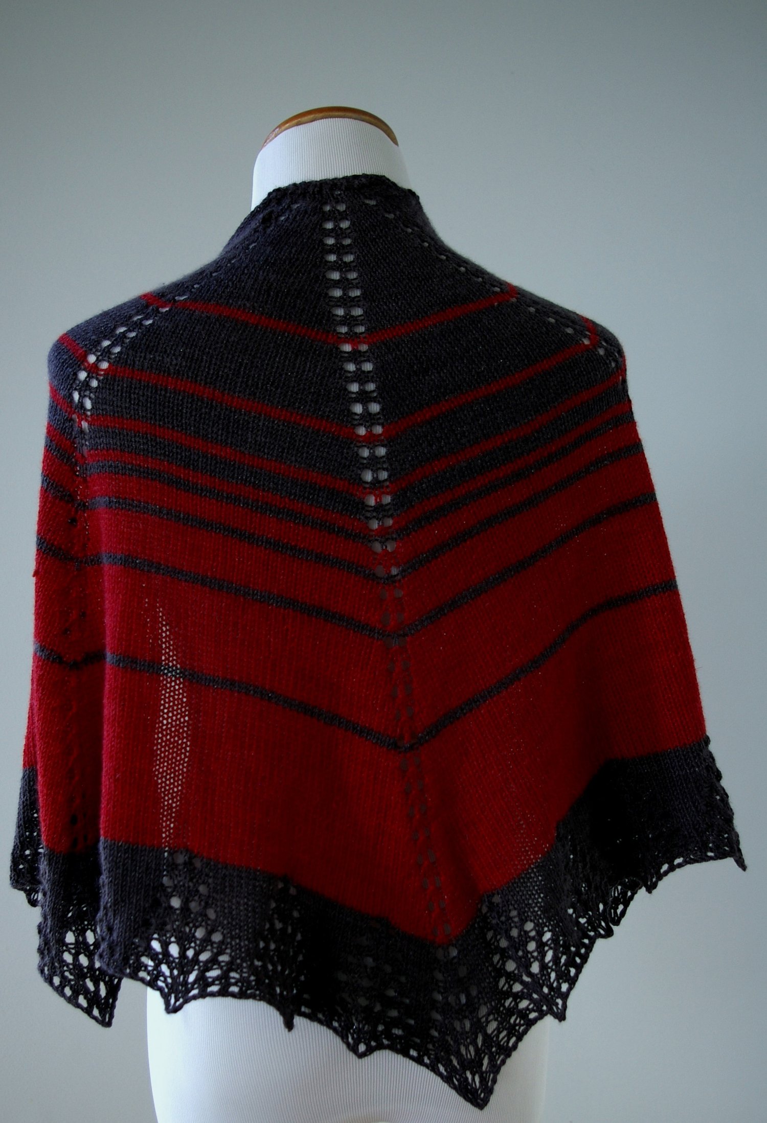 The shawl is worked with the same general principles as a traditional top-down triangle, but instead of two wedges with increases every other row, it has four wedges with increases every fourth row. This simple change creates a much more crescent shape that is flattering on the body but still easy to work. For the border, the increases that had been part of the wedges switch to the other side of their markers, making little triangles at the very ends of the spines—much like meteors at the ends of their descent to earth.