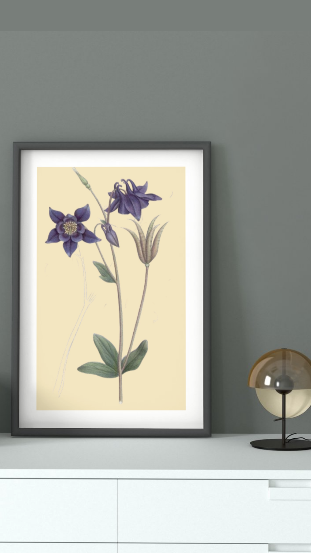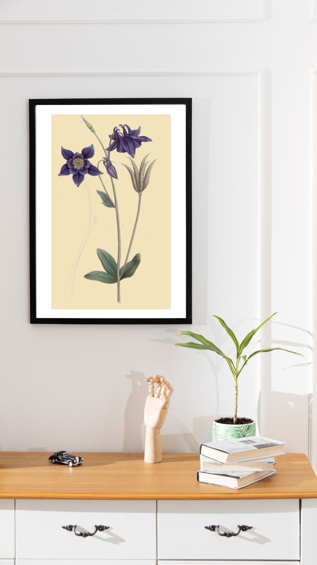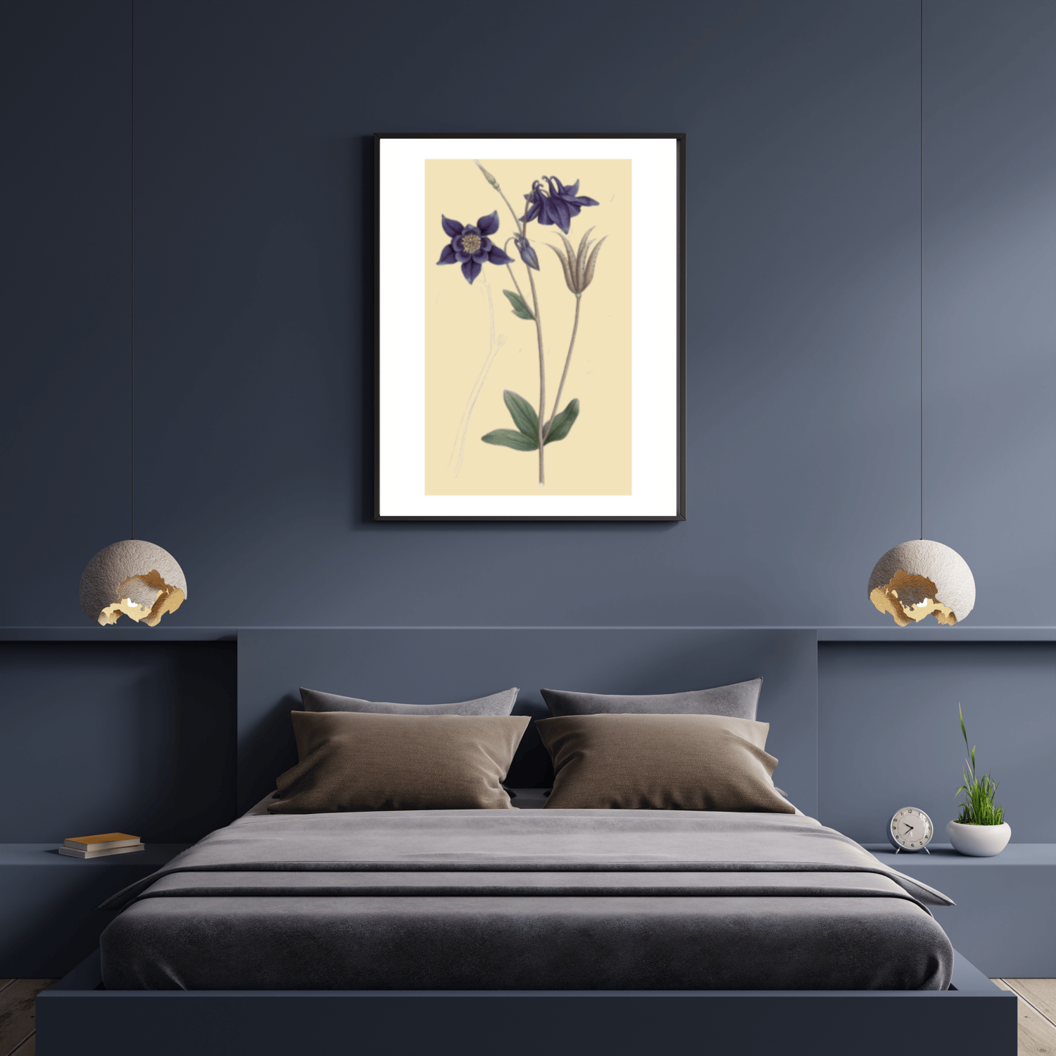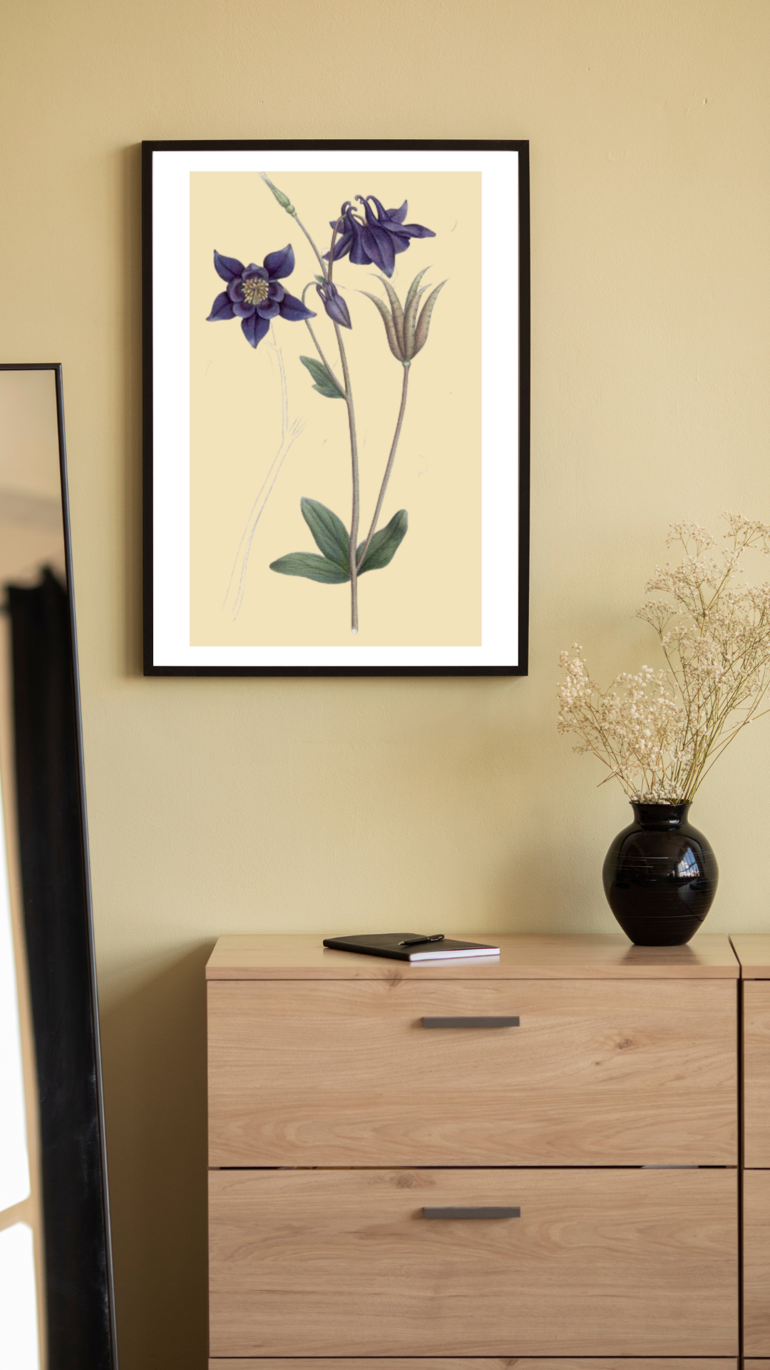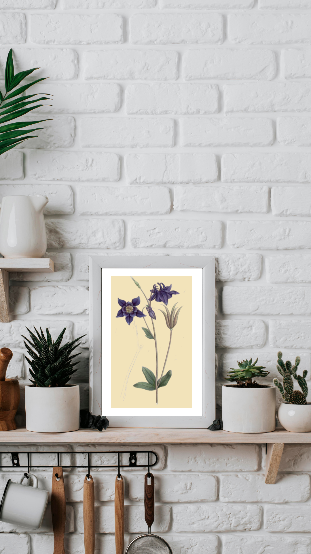 Elegant Aquilegia pressed flower illustration, the second design in the Botanical Triptych Wall Art series. Known as “Columbine,” this flower appears in Shakespeare’s works and has long been a symbol in art and literature.