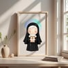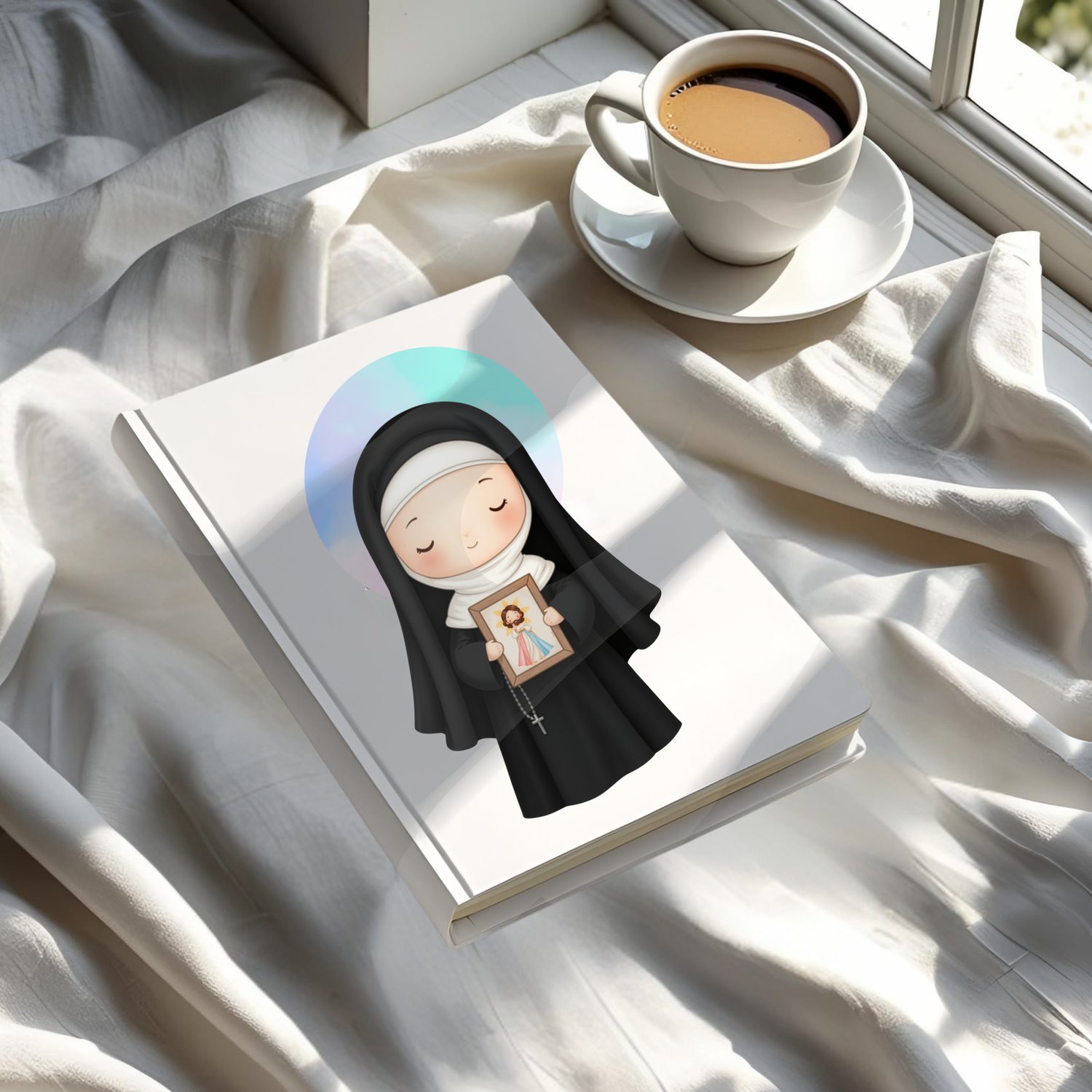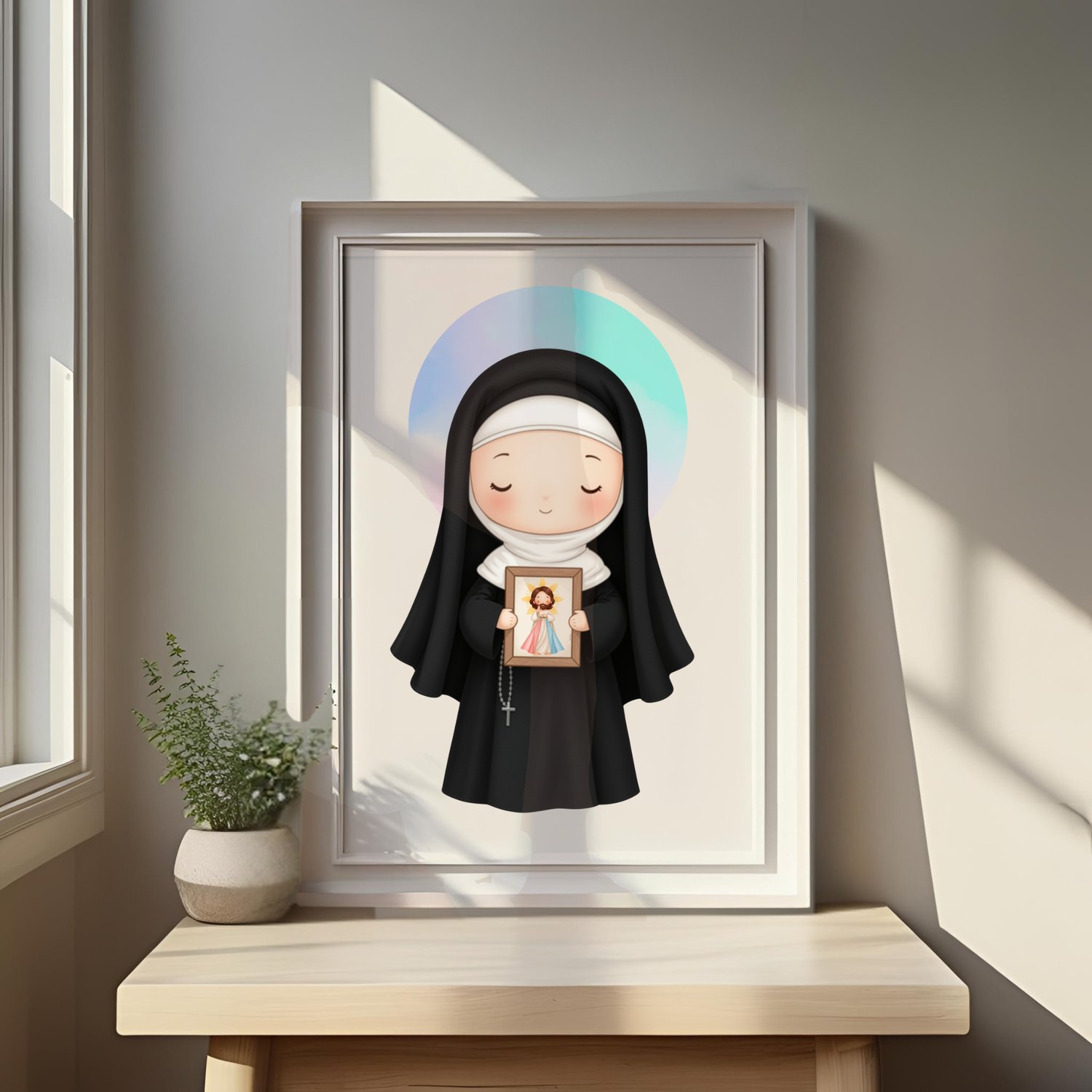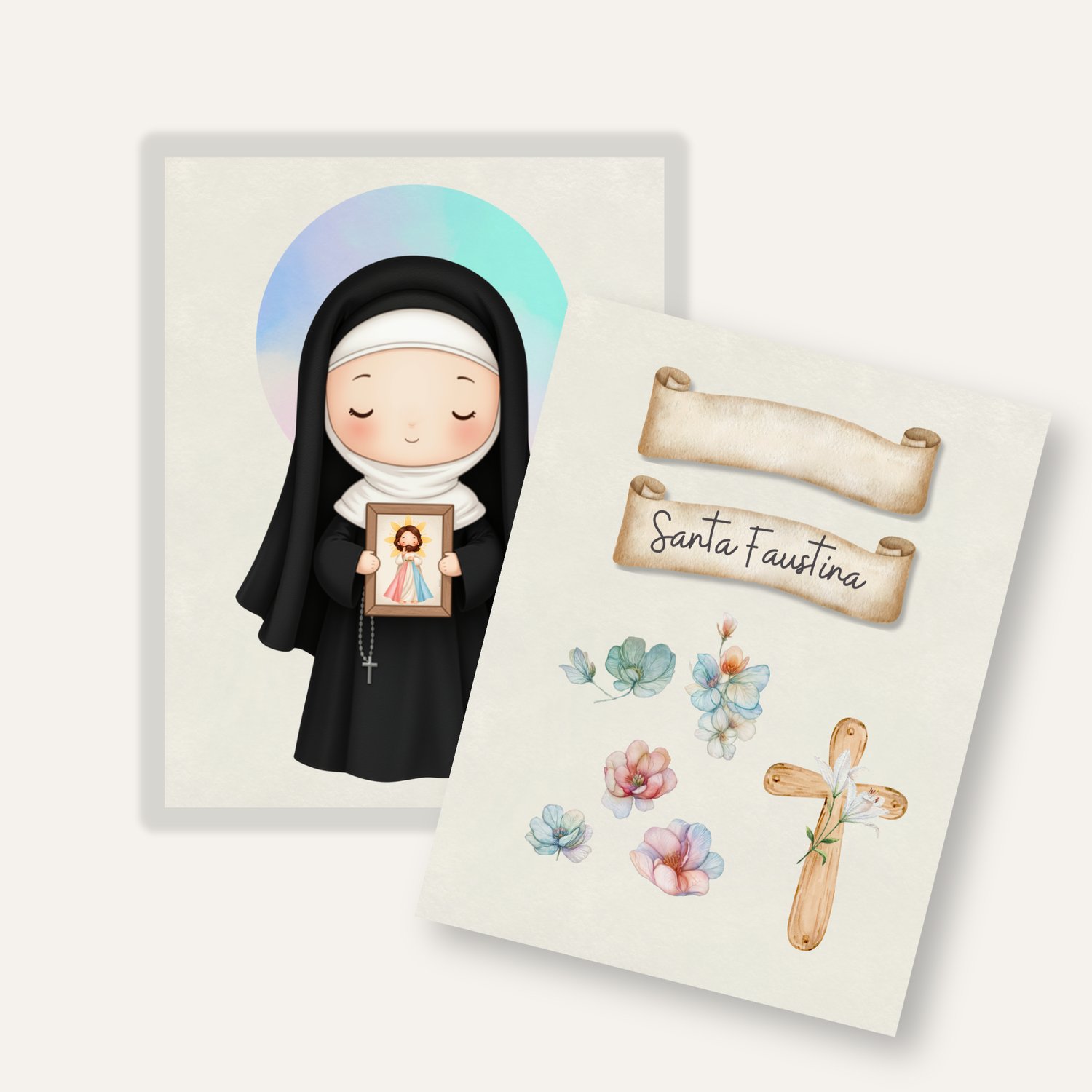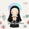 1x Ilustración principal de Santa Faustina: Una imagen completa de la santa, en un estilo dulce y moderno, sosteniendo la imagen de la Divina Misericordia. Ideal para invitaciones, estampitas, posters, y más.