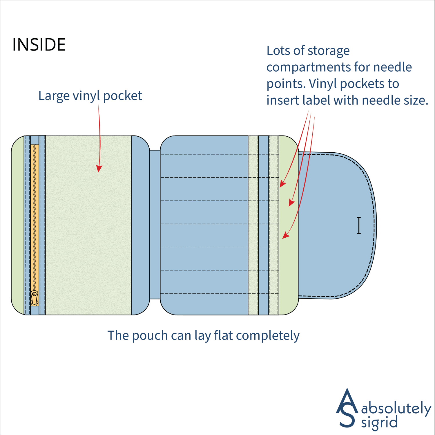 The exterior features two spacious zippered pockets, perfect for storing circular knitting cables. Inside, one side is designed to hold interchangeable knitting needles, while the other has a transparent storage compartment for scissors, end caps, stitch markers, and more.
