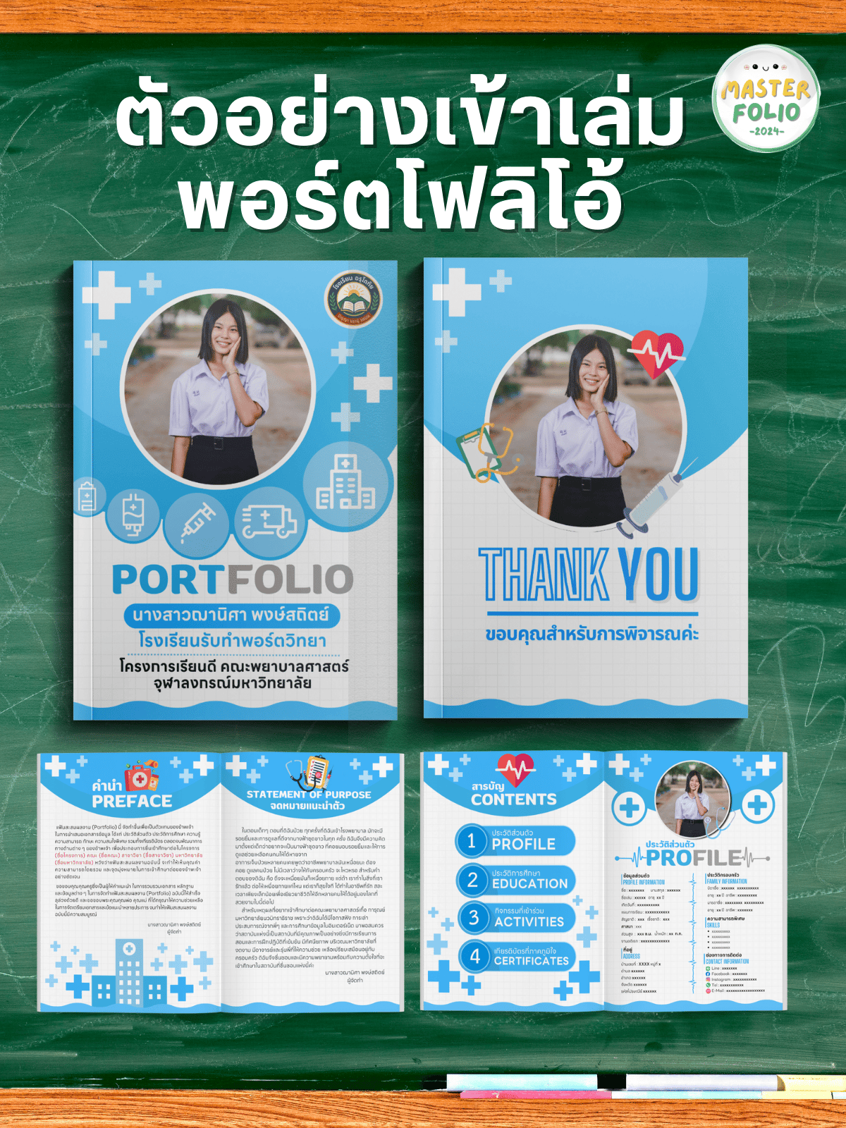 • มีโครงสร้างครบ: Preface/SOP/Contents/Profile/Education/Transcript/Activities/Certificates/Thank You