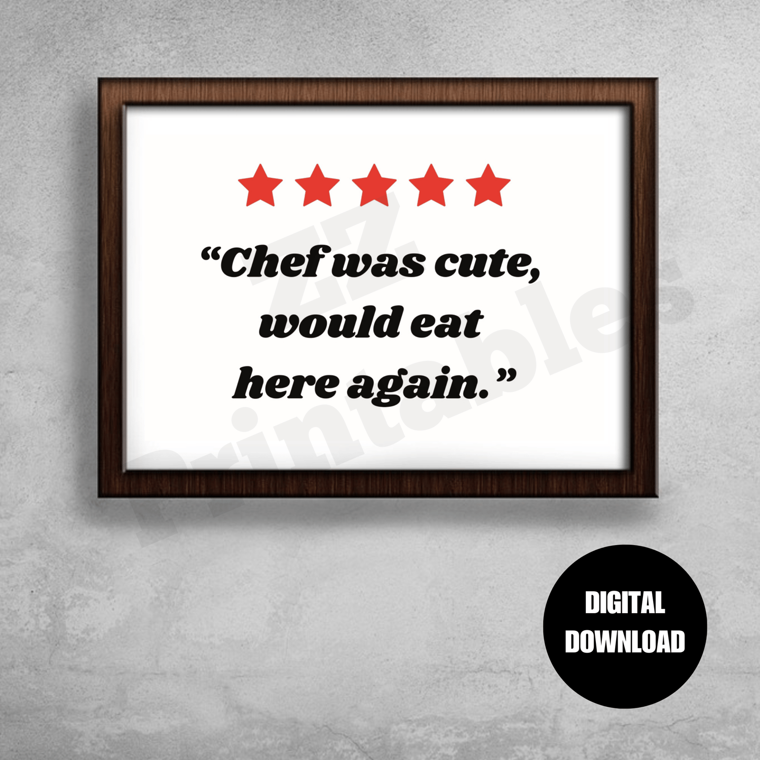 Chef was cute, would eat here again. A funny kitchen quote star rating dining room decor printable wall art poster print. The humorous saying comes in 5 different sizes. The digital download consists of a zipped file containing 5 high quality JPEG files (300 dpi) and a PDF size chart to help you choose the right file for the printing size you want.