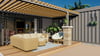 This modern house plan is an architectural masterpiece designed using six 40-foot shipping containers. The containers are elevated off the ground on a raft foundation and arranged in a courtyard layout to create a modern container floor plan with 4-5 bedrooms, 3 bathrooms, laundry, a home office, a family room, and an open-plan living. The living room opens onto a large outdoor deck with alfresco dining overlooking the courtyard with the pool and a spacious pool deck area, perfect for entertaining.