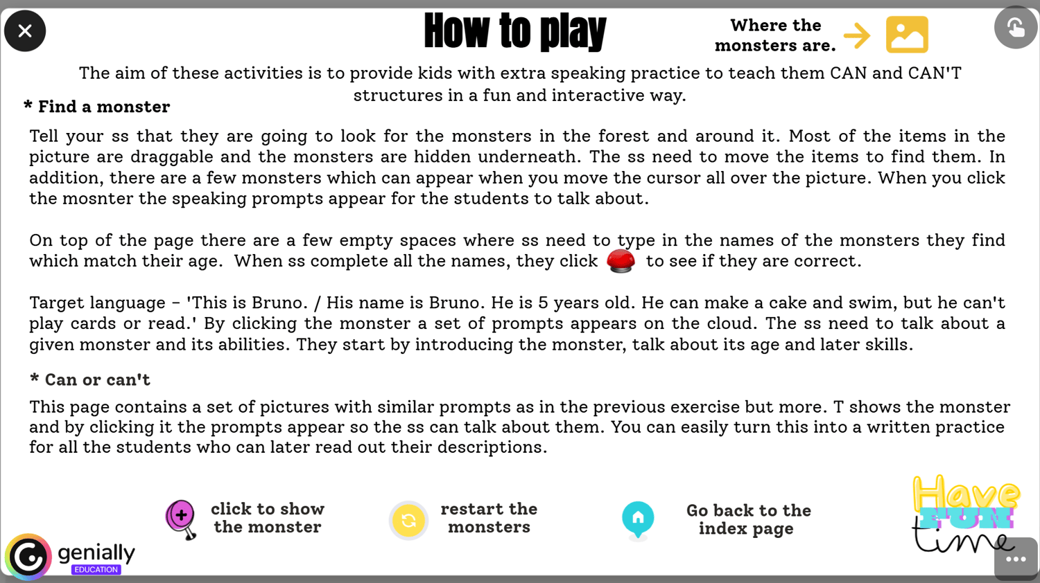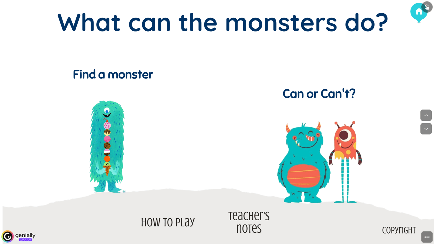 What can the monsters do? REUSABLE - Genially interactive resources to teach English