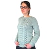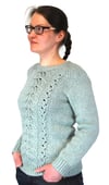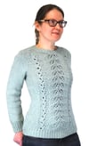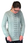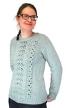 A twin-leaf lace panel cascades down the front, beginning at the neckline and flowing seamlessly into twisted ribbing on the hem. Otherwise the sweater is done in stockinette, allowing the lace to take center stage. Long sleeves are tapered to the wrists, then finished in matching twisted ribbing for a cohesive look.