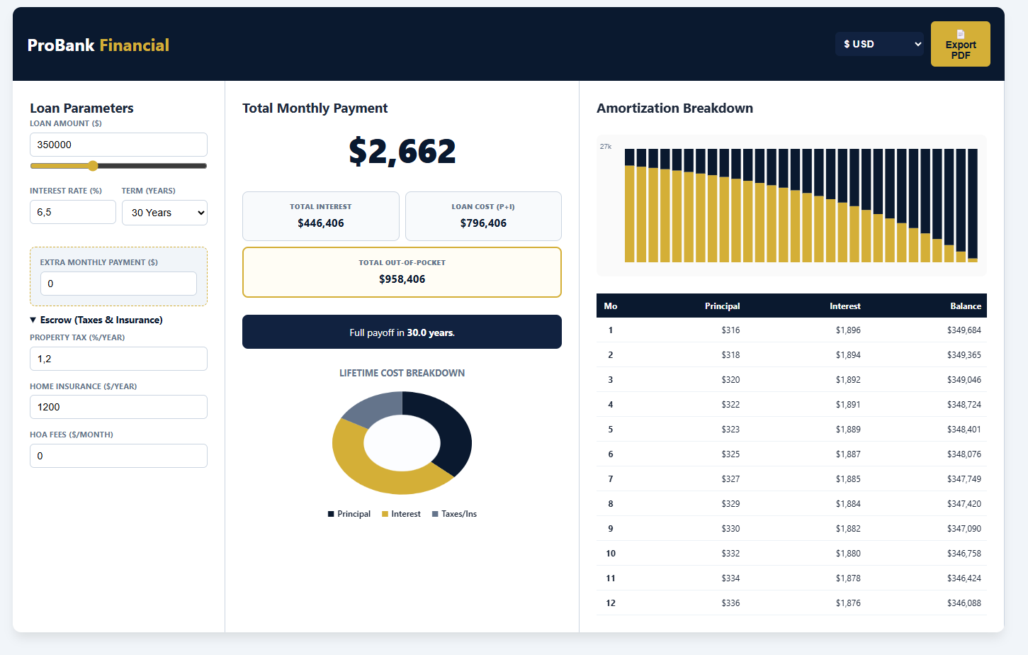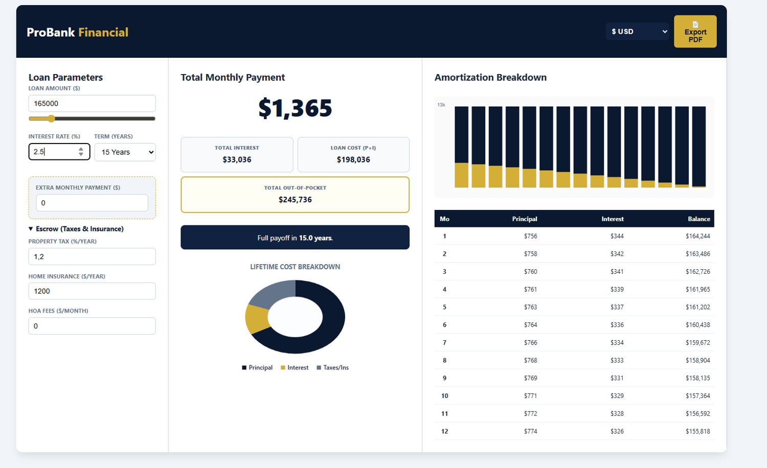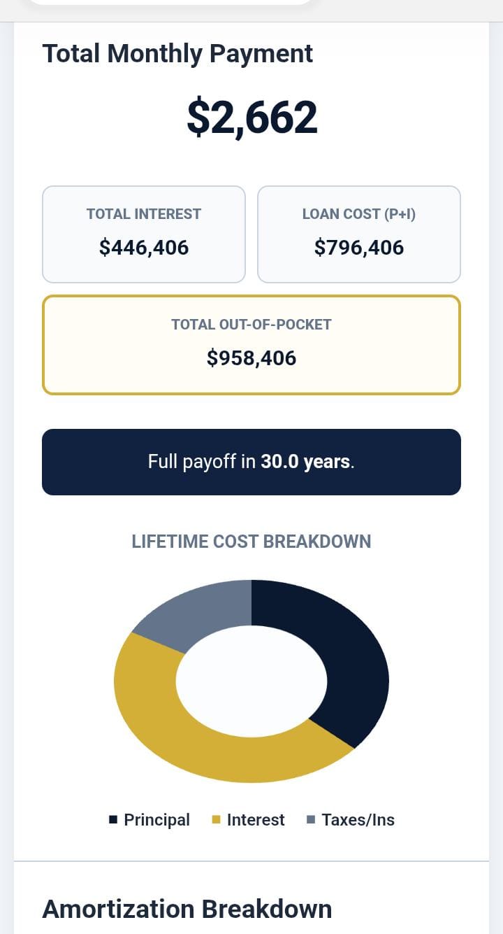 ✅ **Live Amortization Schedule**: First 12 months + yearly breakdown