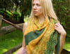 Yarn: Avalon Springs Farm Love Potion, Superwash Merino and bamboo, 555 yd/113 g (X m/4 oz): 1 skein each in Green (C1), Variegated (C2) and Yellow (C3)