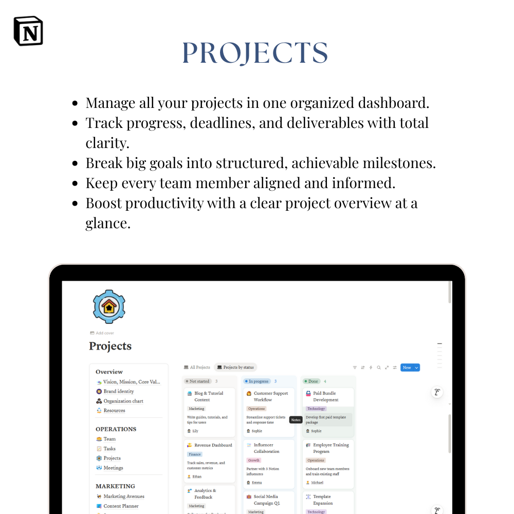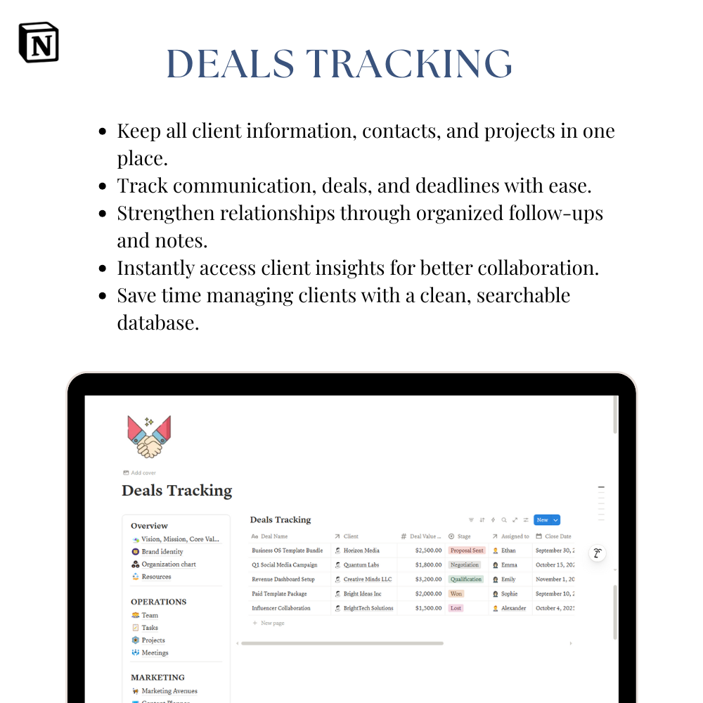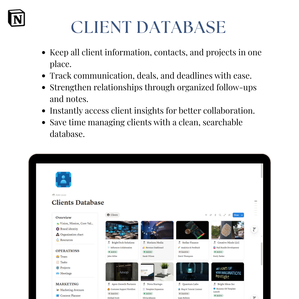 With a clean, structured design and powerful databases, you can easily stay on top of day-to-day operations, team workflows, and long-term strategy. From client deals and project milestones to team tasks and reviews, everything you need to run your business smoothly is right here.
