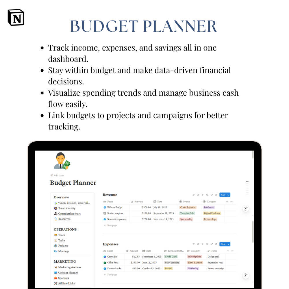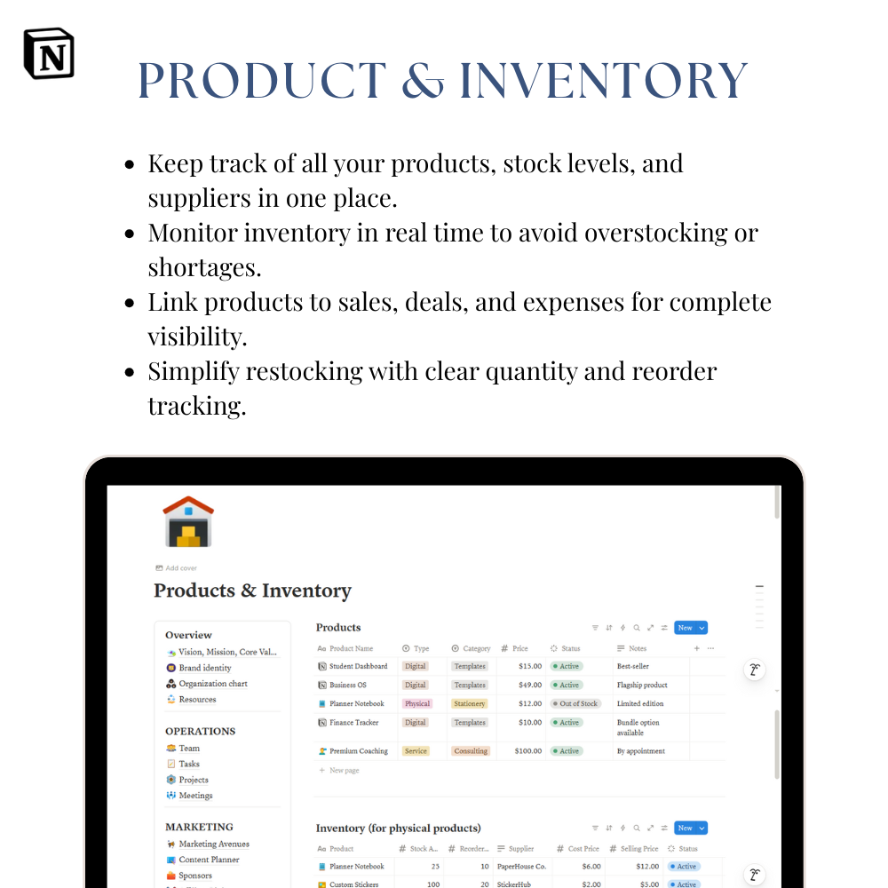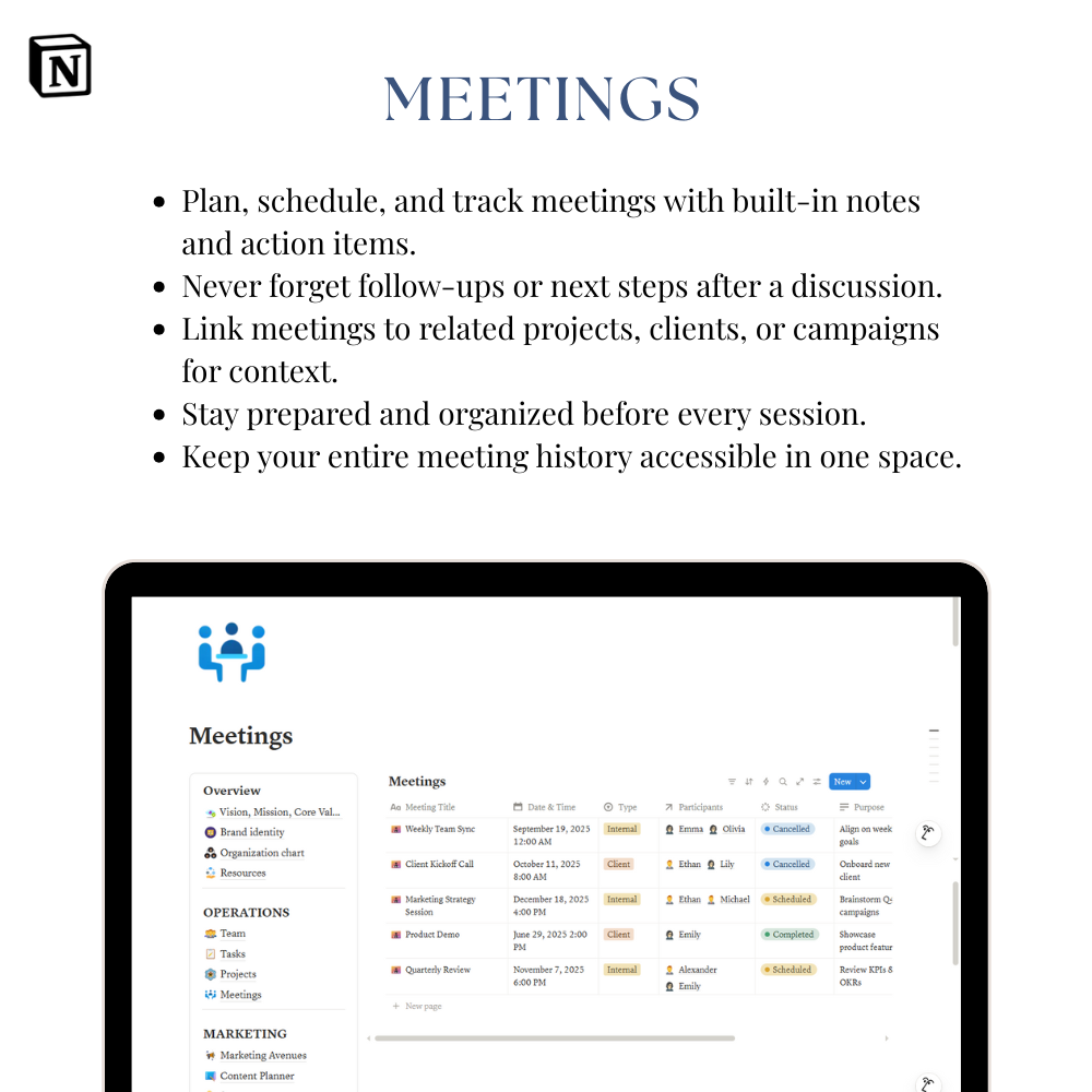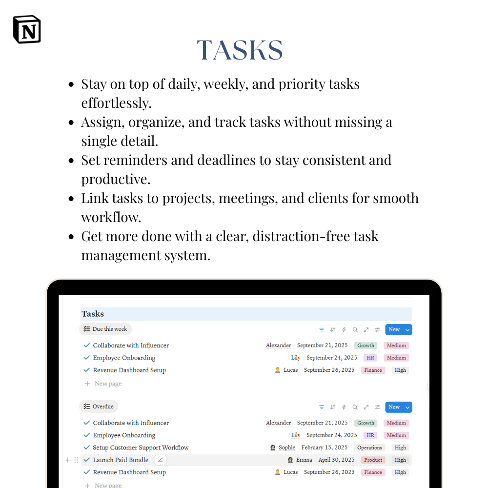 With a clean, structured design and powerful databases, you can easily stay on top of day-to-day operations, team workflows, and long-term strategy. From client deals and project milestones to team tasks and reviews, everything you need to run your business smoothly is right here.
