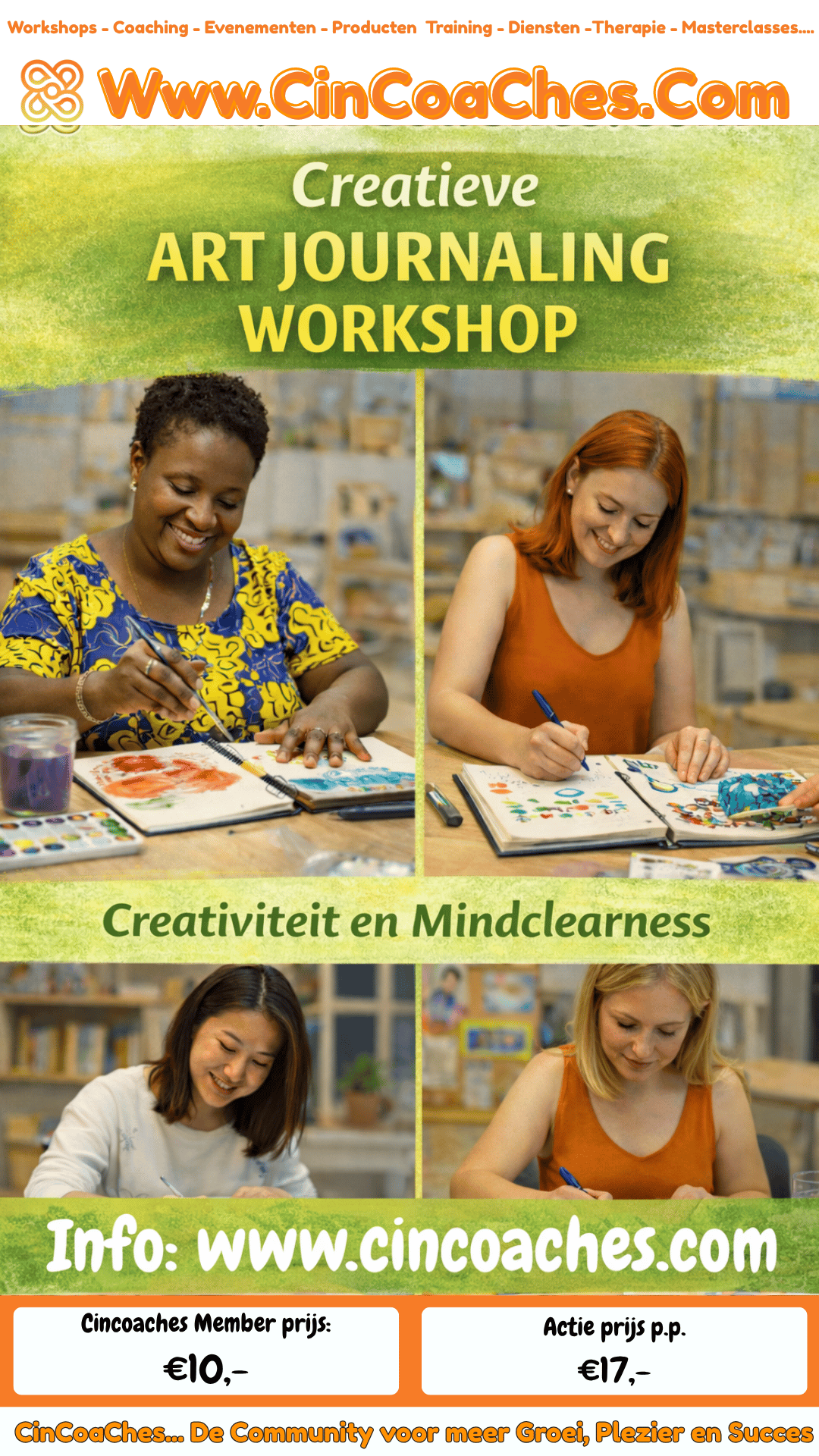 Genieten, Crëeren en Persoonlijke groei met wekelijkse Art Journaling. In je persoonlijke A5, A4 of A3 map maak je wekelijks verschillende kunstwerken met elke verschillende materialen en stijlen, versterkt door een stukje helende of krachtige tekst of affirmaties die je een persoonlijke boost geven. Kom elke week of wanneer je wilt om te ontspannen en persoonlijk te groeien. Elke keer diverse onderwerpen ter inspiratie zoals: Loslaten, Zelfliefde, Succes, Gezondheid, Zelfvertrouwen en meer. Alles met gratis hapjes & drankjes,