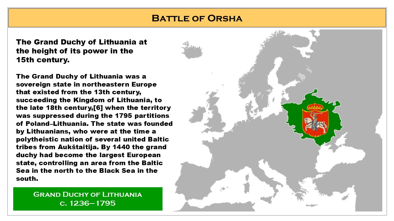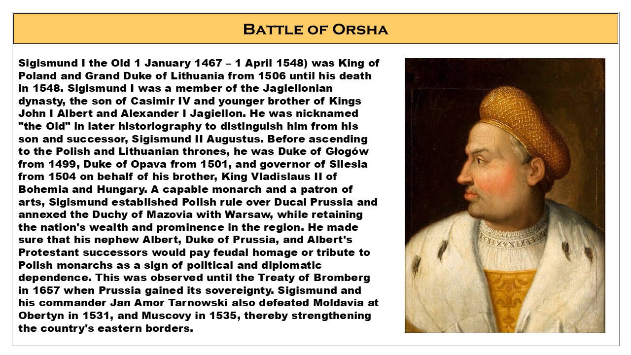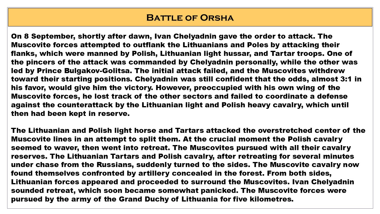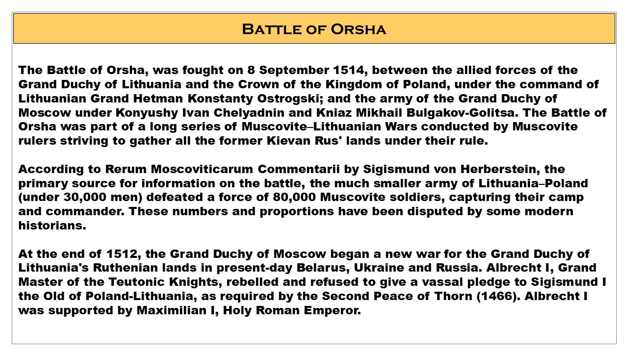 The Battle of Orsha, was fought on 8 September 1514, between the allied forces of the Grand Duchy of Lithuania and the Crown of the Kingdom of Poland, under the command of Lithuanian Grand Hetman Konstanty Ostrogski; and the army of the Grand Duchy of Moscow under Konyushy Ivan Chelyadnin and Kniaz Mikhail Bulgakov-Golitsa. The Battle of Orsha was part of a long series of Muscovite–Lithuanian Wars conducted by Muscovite rulers striving to gather all the former Kievan Rus' lands under their rule.
