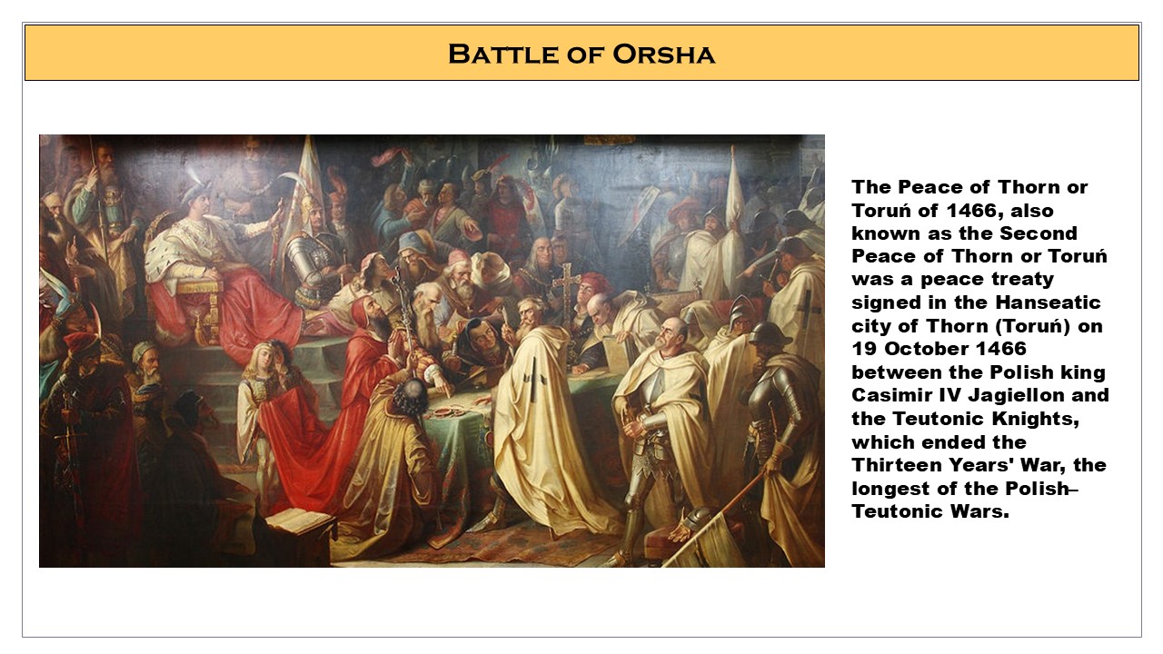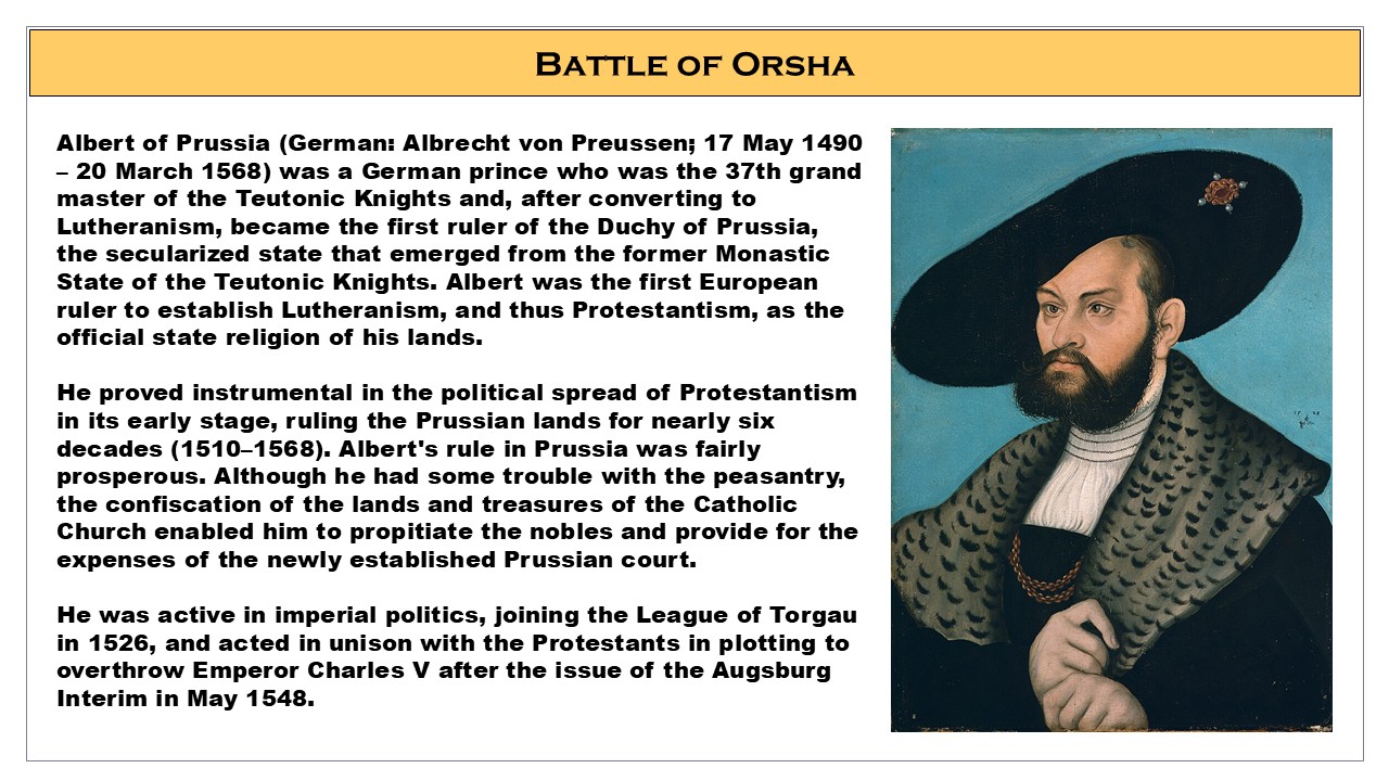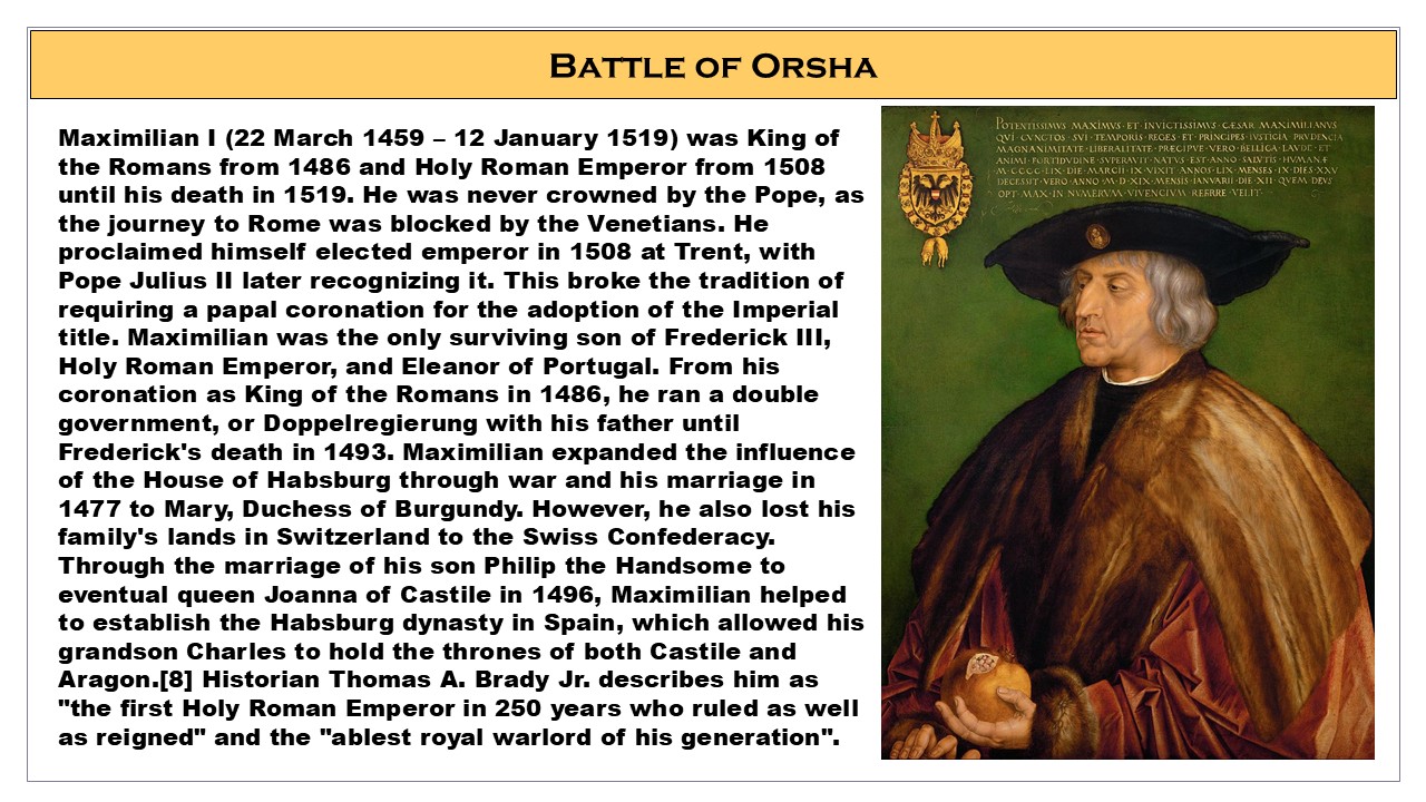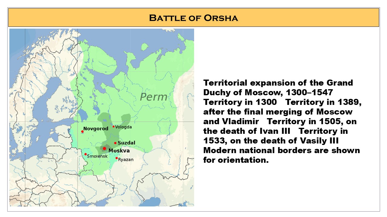 The Battle of Orsha, was fought on 8 September 1514, between the allied forces of the Grand Duchy of Lithuania and the Crown of the Kingdom of Poland, under the command of Lithuanian Grand Hetman Konstanty Ostrogski; and the army of the Grand Duchy of Moscow under Konyushy Ivan Chelyadnin and Kniaz Mikhail Bulgakov-Golitsa. The Battle of Orsha was part of a long series of Muscovite–Lithuanian Wars conducted by Muscovite rulers striving to gather all the former Kievan Rus' lands under their rule.